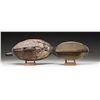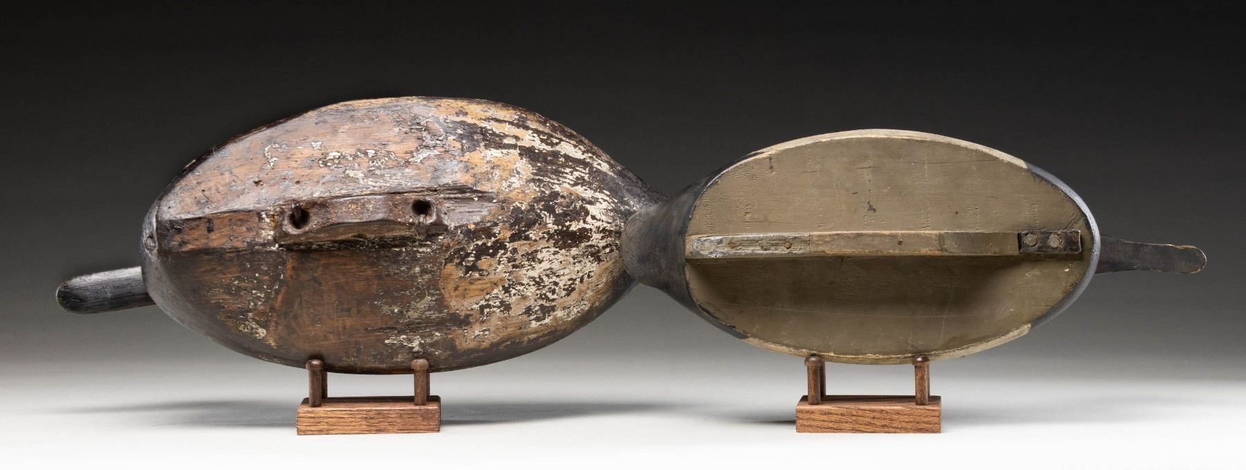 1) Solid body flat bottom with keel, 17" with glass eyes and stand. Nice feather pattern paint on back. CONDITION: very good; most likely original paint with some minor chips. 2) Oversized solid body old decoy, 19" with stapled heavy lead weight and stand. CONDITION: old worn paint probably stripped revealing original. PROVENANCE: From the Private Collection of Berrien Moore III. (02-25872-9/MGM). $250-500.