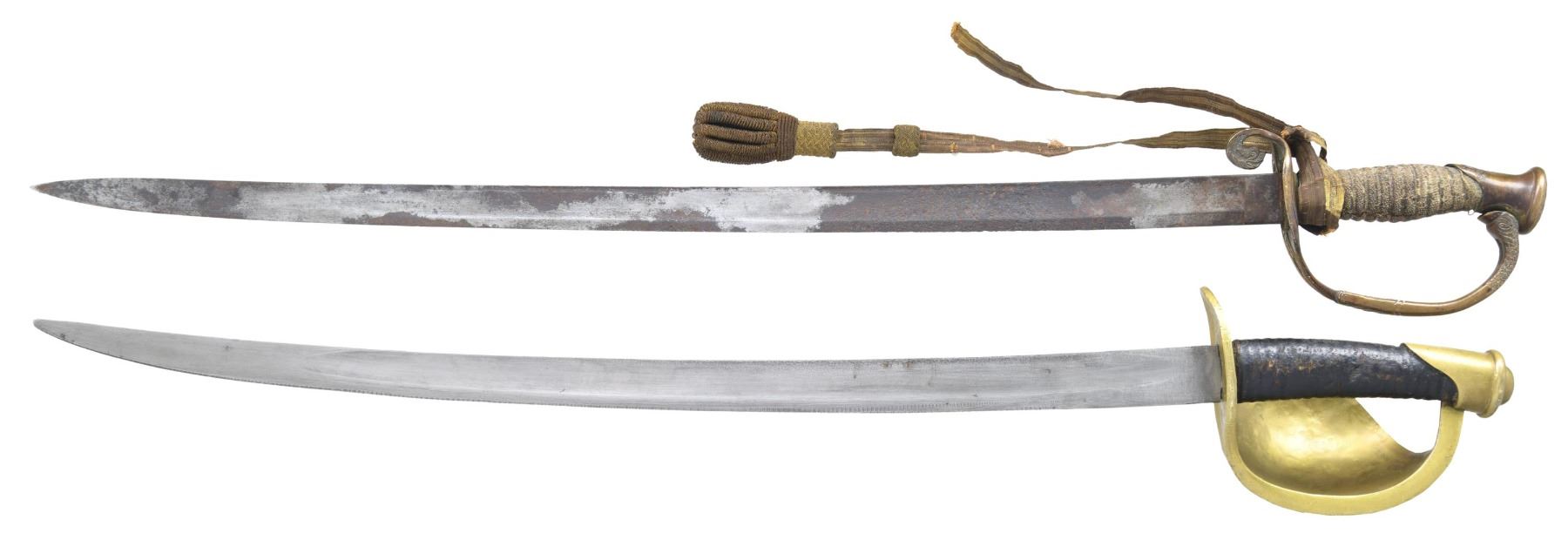 1) CUTLASS. Overall length: 31 5/8". Blade length: 25 3/4". Plain blade with a single large fuller. Stamped on one side of the ricasso "186_". Solid brass basket hilt with small rivets along the knuckle bow. The top of the guard is stamped "23M 243". Leather wrapped grip. No scabbard. CONDITION: blade has a medium gray patina and does show evidence of sharpening. Hilt shows numerous small dimples in the guard. Grip shows wear but is substantially complete. 2) OFFICER. Overall length: 33 1/2". Blade length: 28". Plain blade with a single line fuller and a secondary fuller near the spine. Gilded brass hilt with a pierced oak leaf adorned guard featuring the letters "USN". Dolphin quillon with another dolphin at the top of the knuckle bow. Pommel has a large anchor on the front and a eagle with stars on the top. Wire wrapped shark skin grip with a sword knot attached. No scabbard. CONDITION: blade shows areas of heavy rust and pitting. Hilt is a bit loose but is complete and undamaged. Grip shows heavy wear with only a trace of wire remaining. Knot is worn and broken but remains complete. (02-23829/BF). $700-900.