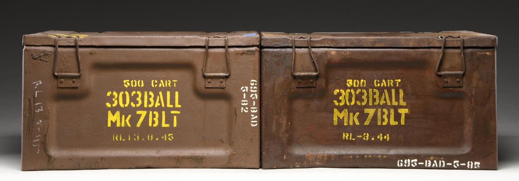 Brown painted steel cans with paint markings "500 CART / 303BALL / MK 7BLT" on side & "303 / BLT 7" on top. Each case contains 2 wooden ammo boxes for MK 1 Vickers MG containing 250 rds. of Mark 7 Belted ball ammo each; 1000 rds. total. CONDITION: ammo crates sealed as is with blue tape & ORMD stickers. (02-24584-4/MD). $500-750.