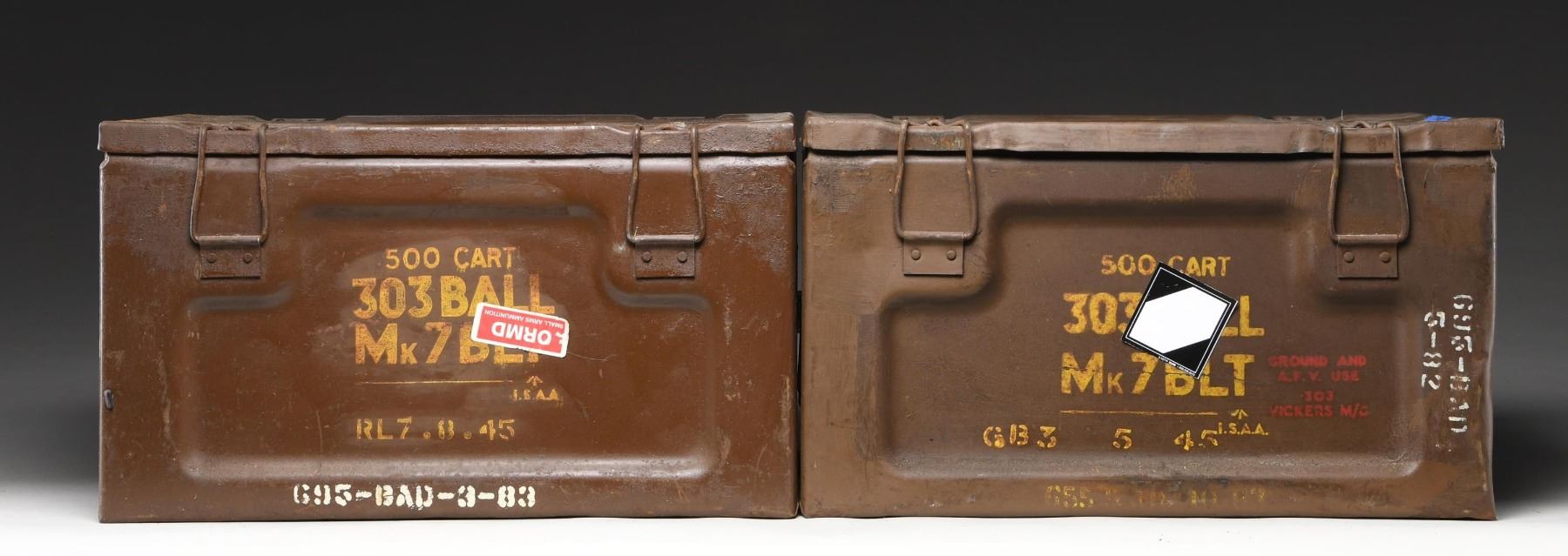 Brown painted steel cans with paint markings "500 CART / 303BALL / MK 7BLT" on side & "303 / BLT 7" on top. Each case contains 2 wooden ammo boxes for MK 1 Vickers MG containing 250 rds. of Mark 7 Belted ball ammo each; 1000 rds. total. CONDITION: ammo crates sealed as is with blue tape & ORMD stickers. (02-24584-5/MD). $500-750.