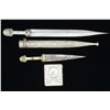 CIGARETTE CASE. 1) KINDJAL. Overall length: 19 1/2". Blade length: 14 1/2". Kindjal has a typical blade w/ a single central fuller. Silver covered haft w/ foliate decoration. Matching scabbard is also silver covered w/ foliate & geometric incised decoration. CONDITION: blade has a light gray finish. Hilt is missing the silver cover on the lower boss. Scabbard has a few shallow dents & overall light wear. 2) KINDJAL. Overall length: 12 1/4". Blade length: 7 5/8". Kindjal has a typical blade w/ a single central fuller on 1 side & a dbl. central fuller on the other. Silver covered haft w/ engraved lineal wrigglework decoration. No scabbard. CONDITION: blade has a dark patina w/ scattered pitting. Haft shows moderate overall wear. 3) CIGARETTE CASE. Silver case measures approx. 4" x 3 1/2". The front depicts a city scene at the base & a medallion in the center showing 4 Russian soldiers/sailors charging w/ rifles w/ planes above. The rear of the case is engraved, “Celadomam Egonam Par 1943.g. nozvejas plana izpildi liolz 1943.g. 19. Maijam zv. Artelis Bolseviks.”. CONDITION: case shows light wear overall. (02-14933/BF). $500-800.