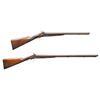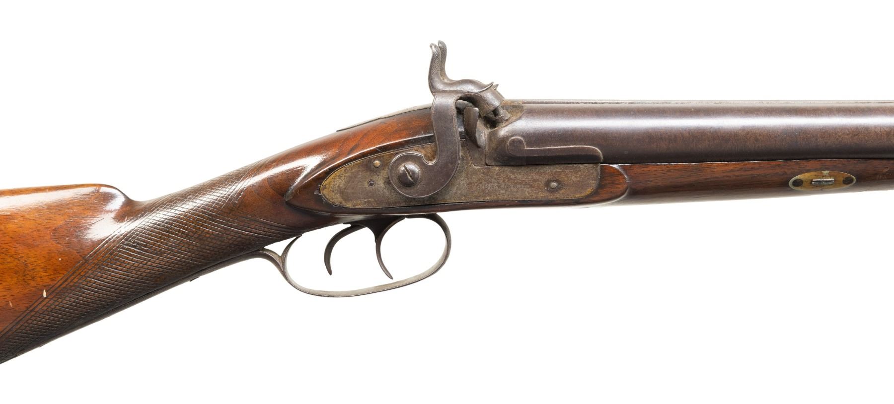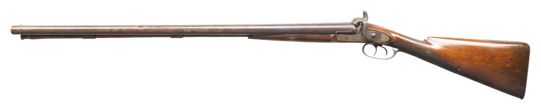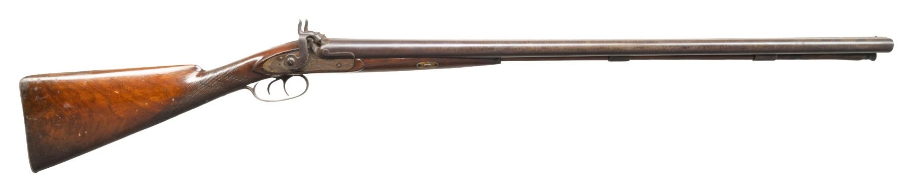 2) WILLIAM WINGERT. William Wingert operated out of Detroit, MI 1837-1867 making percussion rifles and pistols with brother John A. Wingert. Bbls. 31" w/ front bead. Hammer locks marked "WM WINGERT". Wedge fastened walnut stock. CONDITION: metal has brown patina appearance with marks & spots of corrosion. Sanded & refinished wood with cracks, dings & sm. chips. Dark oxidized bores w/ large dent to left barrel. Mechanically fine. PROVENANCE: From the PMRB Collection. (01-28432/MD). ALL ANTIQUE. $500-700.