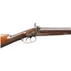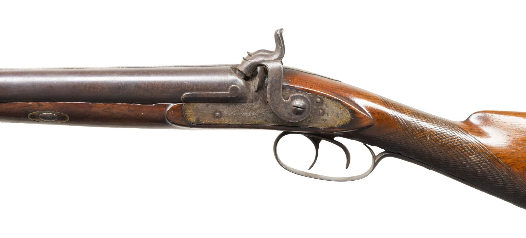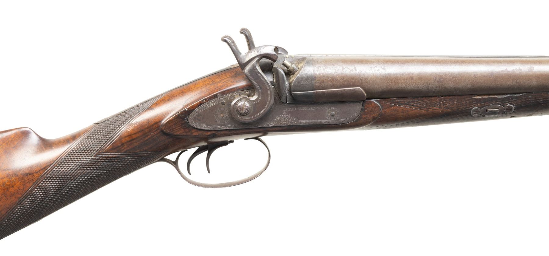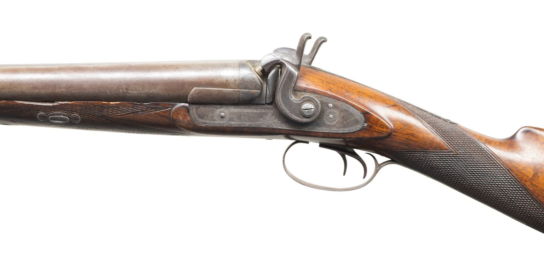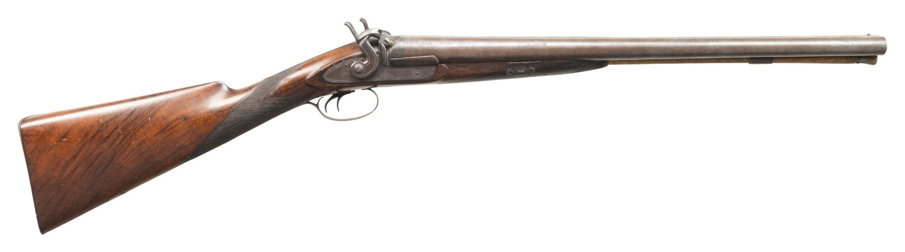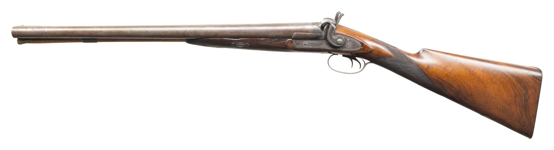 1) FISHER & LONG STAGECOACH STYLE. Fisher & Long operated in Detroit, MI 1867-1875 marking percussion double shotguns. Both worked for William Winger & acquired his shop when he retired. Bbls. 21" w/ brass front bead & Birmingham Black Powder proofs. Hammer locks engraved "FISHER & LONG". Wedge fastened checkering walnut stock w/ carved rounded edges around locks & German silver toeline name plate. CONDITION: laminated barrels have light brown patina appearance. Other metal have brown patina appearance with traces of blue & peppery oxidation. Wood has good finish showing worn checkering at forearm, cracks & dings throughout. Bores show pitting throughout. Mechanically fine w/ replacement nipples. (01-28431/MD).
