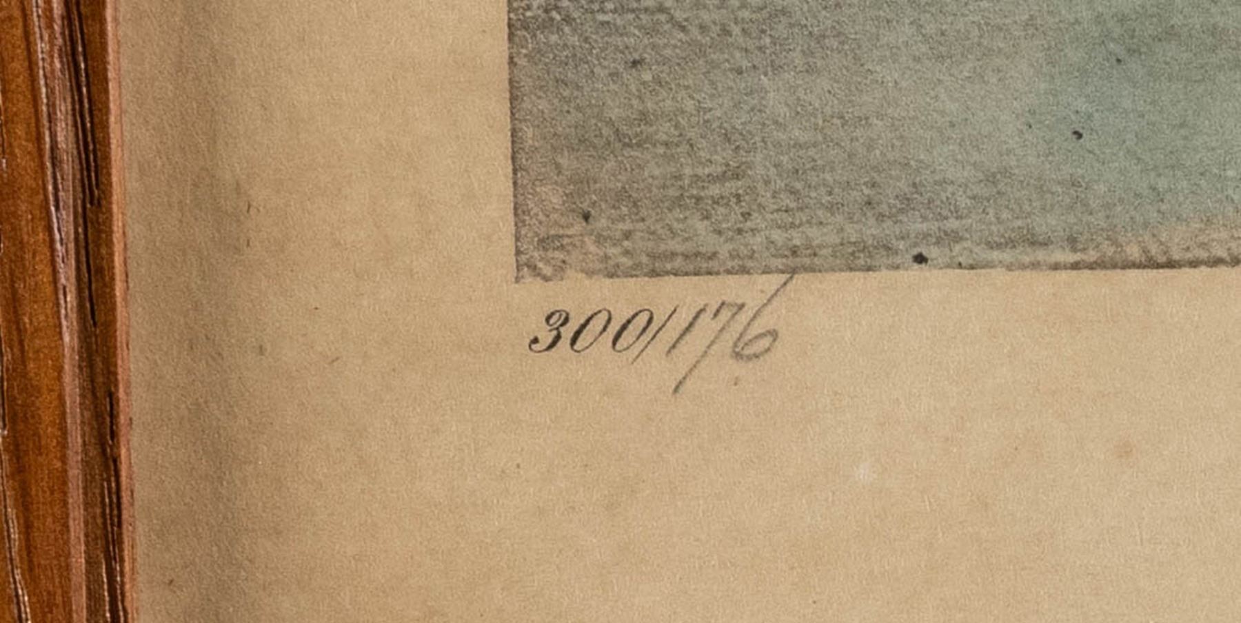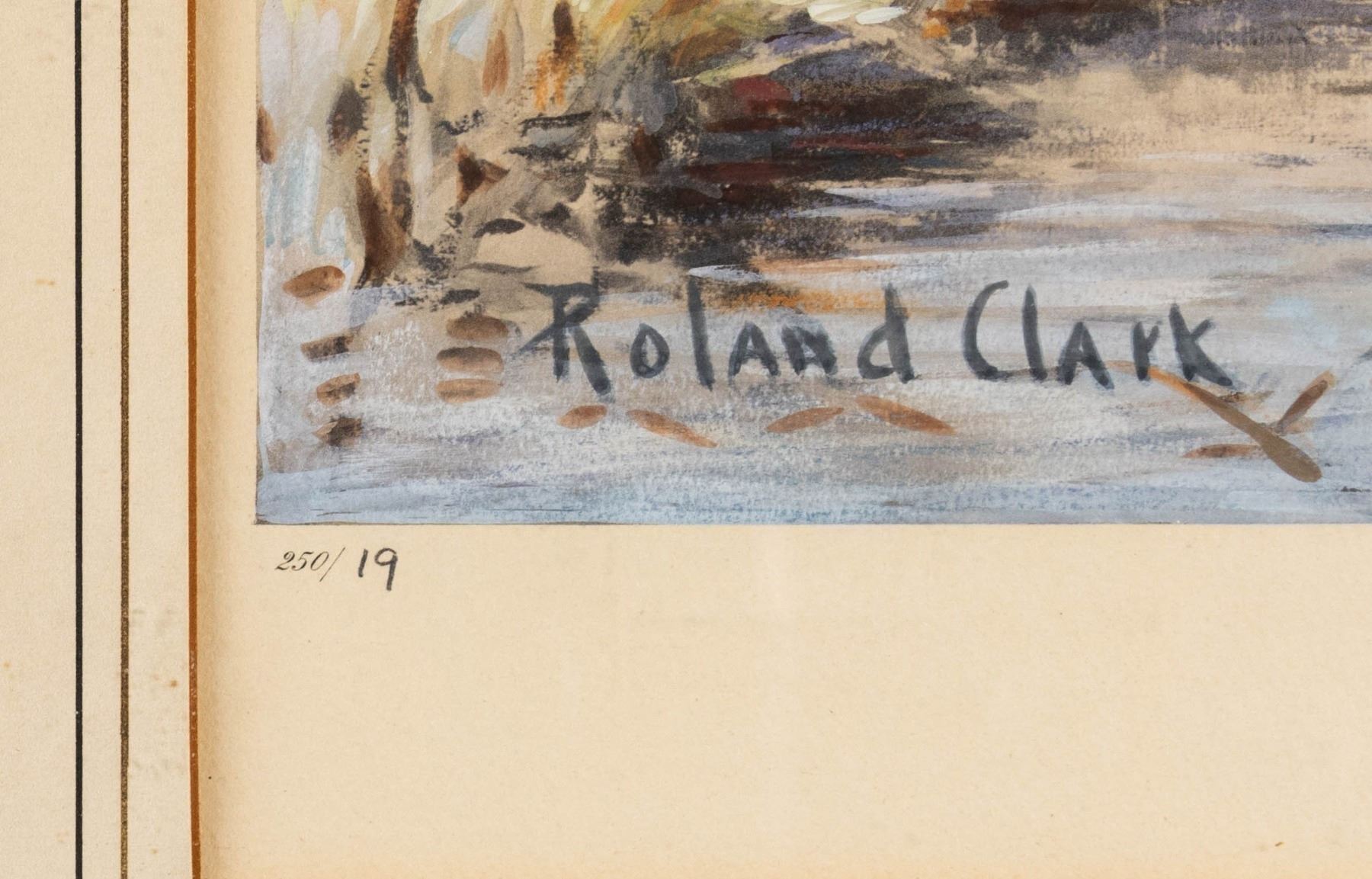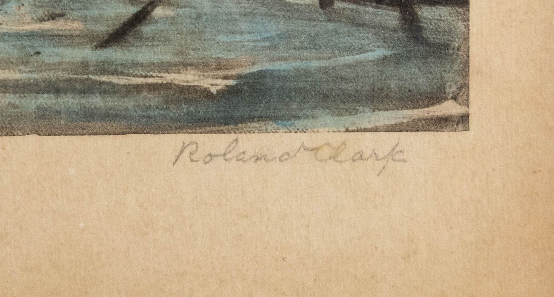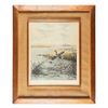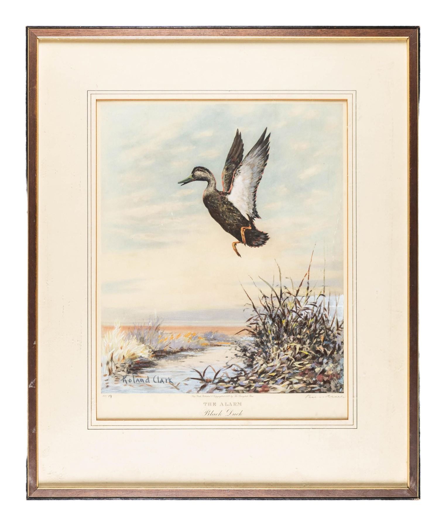 1) Copyright 1937 Derrydale Press "THE ALARM" "Black Duck" "19/250". Signed Roland Clark lower right. SIZE: overall 22-1/2" x 27", sight 14-1/2 x 18". CONDITION: very fine. Housed in old frame and backing; under glass. 2) Copyright 1947 "Up and Away" depicting mallard taking flight. "176/300". Signed Roland Clark lower right. SIZE: overall 28-1/2" x 34", sight 17" x 21-1/2". CONDITION: fine; foxed toward top. Housed in large burlap and wood frame with old backing under glass. PROVENANCE: From the Private Collection of Berrien Moore III. (02-25871-8/MGM). $400-800.