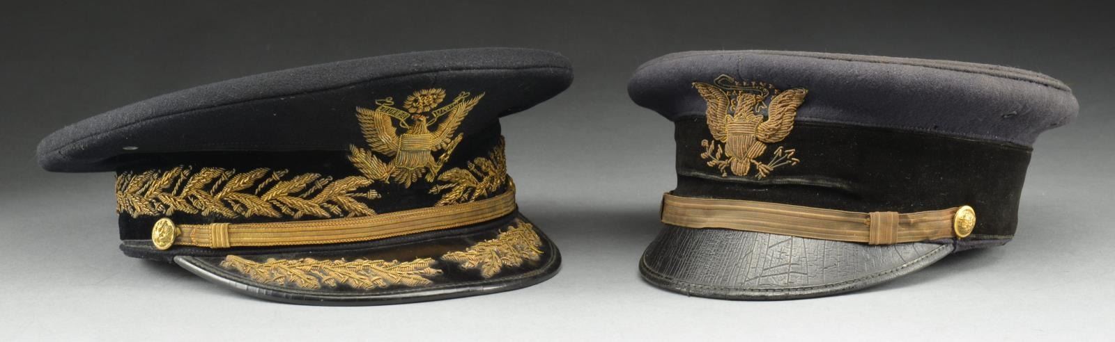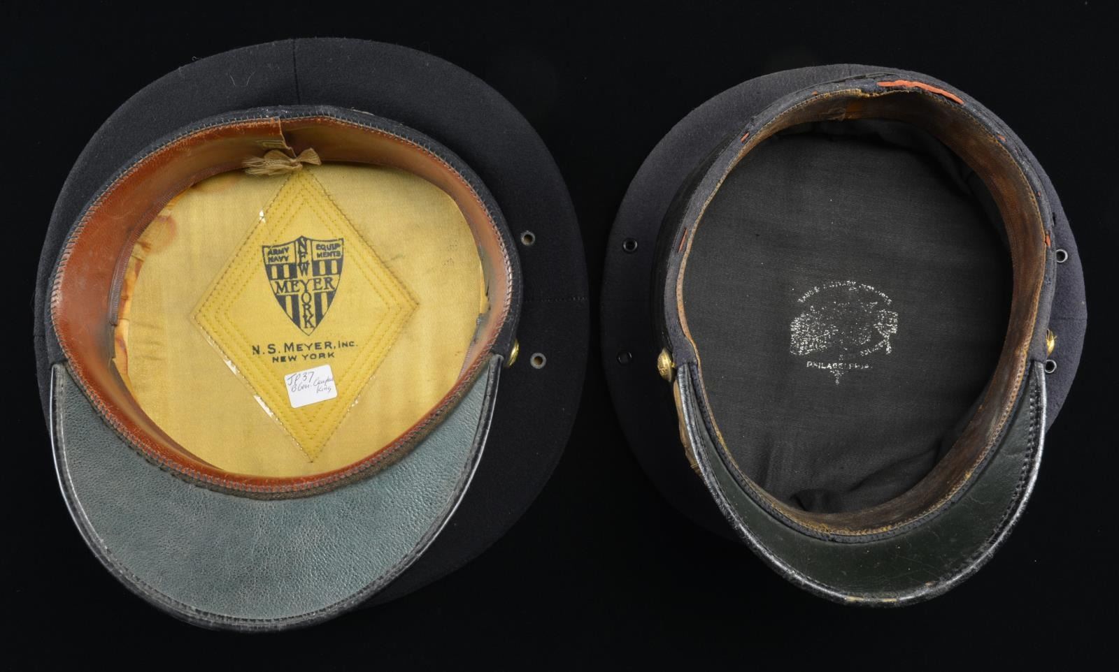 2) OFFICER. An M1902 Army officer’s undress service cap. Crown is faded black w/ a black velvet band. Directly embroidered gold bullion eagle. Gold chinstrap. Bound, downturned visor & brown sweatband. Black polished cotton lining marked in the crown w/ an illegible maker’s mark that ends w/ “PHILADELPHIA”. CONDITION: crown is a bit faded & has a few minor moth nips. Sweatband shows expected wear. The remainder of the hat is quite solid & attractive. (02-15772/BF). $800-1,200.