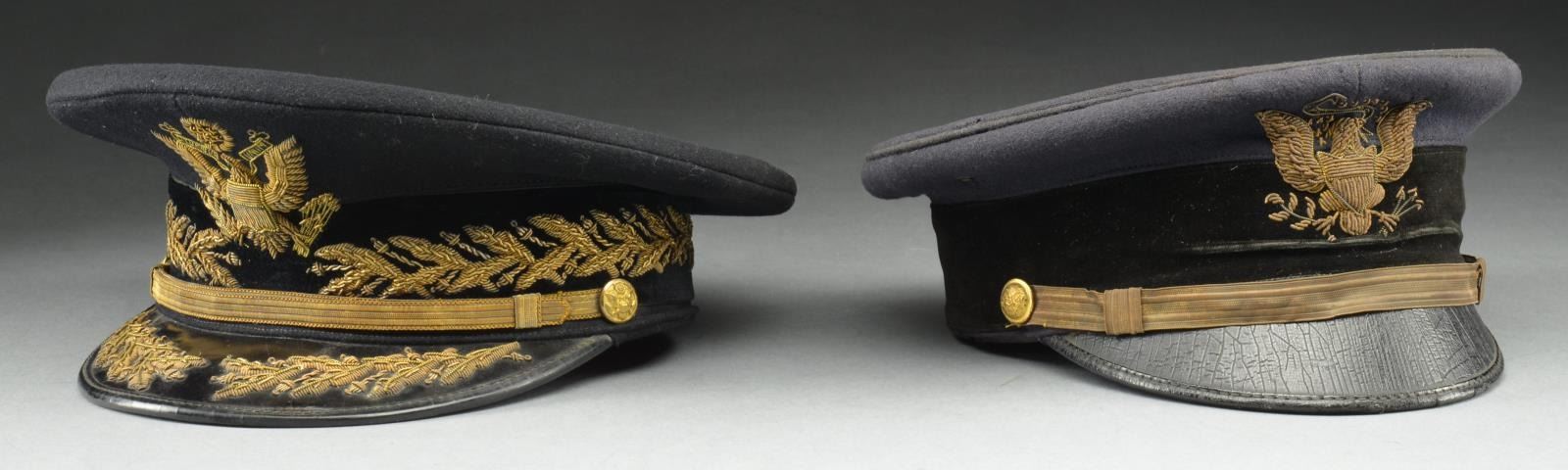 1) GENERAL. A WWI period, full dress General’s visor cap reportedly belonging to Major General Campbell King who served during WWI as Chief of Staff of the 3rd Army Corps American Expeditionary Forces. He was awarded the Army Distinguished Service medal for service as Chief of Staff of the 1st Division in operations near Montdidier, the advance south of Soissons & in the attack on St. Mihiel & later as Chief of Staff of the 3rd Army Corps during the Meuse-Argonne operation. Hat has a black crown w/ black velvet band. There is a beautifully embroidered gold bullion eagle gracing the front of the hat along w/ gold bullion oak leaves & acorns completely surrounding the band & covering the visor. Gold chinstrap. Brown sweatband. Sweatshield reads, “ARMY NAVY EQUIPMENTS MEYER NEW YORK N.S. MEYER, INC. NEW YORK”. CONDITION: hat shows light wear overall & displays beautifully. There is minor wear to the top of the sweatband & scattered sweat stains on the liner.