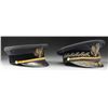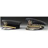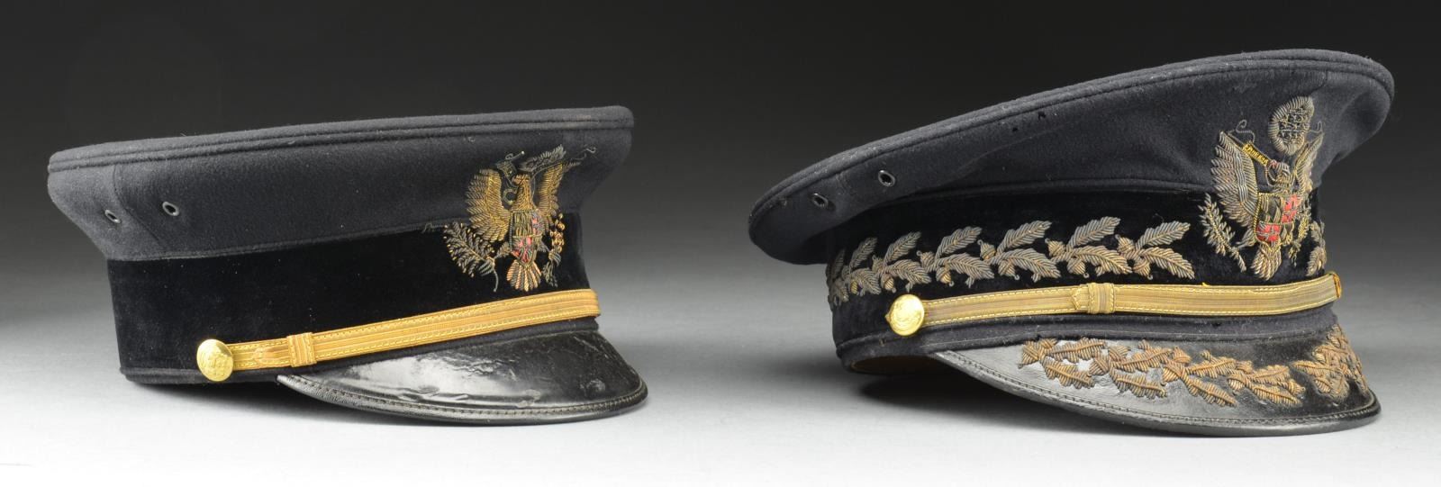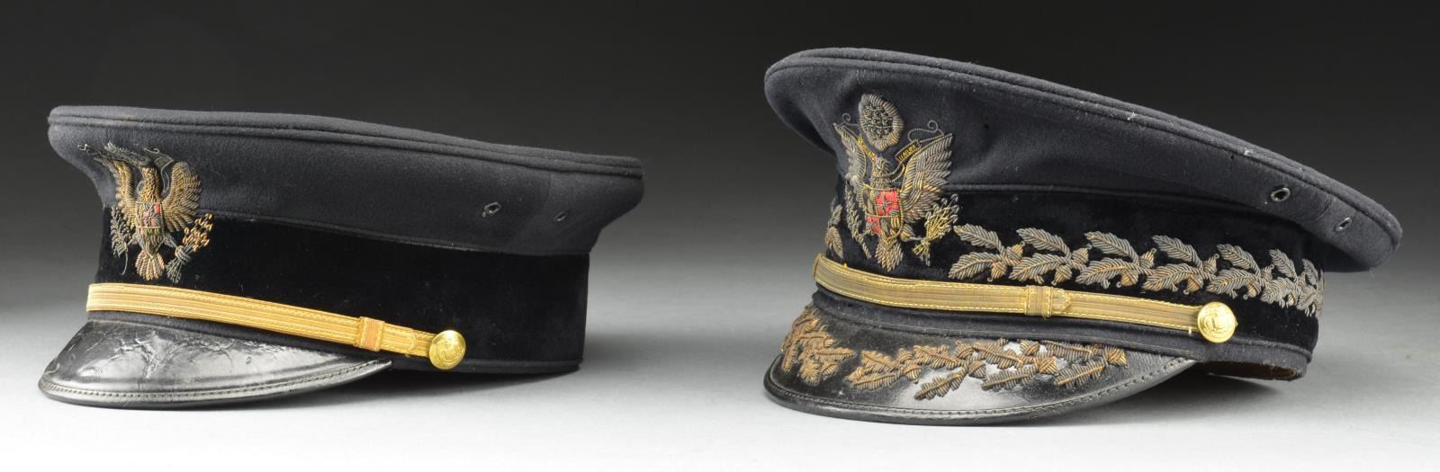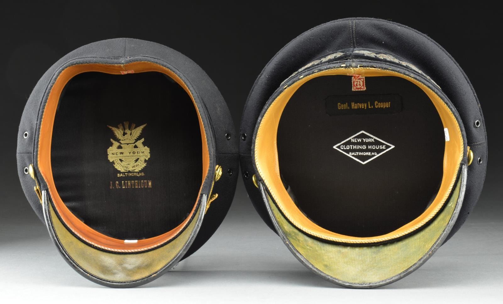1) M1902. A very fine example of an M1902 undress general officer’s hat from Maryland. Hat features a black crown & a black velvet band w/ gold & silver bullion embroidery, highlighted in red, expertly added to the front of the hat. Gold chinstrap w/ Maryland buttons. Full sweatband. Crown is marked, “NEW YORK CLOTHING HOUSE BALTIMORE, MD. J.C. LINTHICUM”. CONDITION: hat shows very light wear w/ minor crazing to visor.