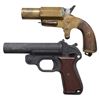 BOTH: cal. 26.5mm. 1) FRENCH MODEL 1917. S# 257 (18). Bbl. 4". Exterior unmarked except for slightly curved line under "V". Bbl. & frame w/ unusual S#'s coming together when read from 2 directions. All brass construction except for screws, latch, hammer, trigger & lanyard loop. Checkered walnut grips. CONDITION: numerous light marks on exterior w/ slightly gouged lower section of right grip. Very good bore w/ almost unused appearance. (02-13862/NW). 2) GECO SIGNAL. S# 30351. Bbl. 6". Matte black finish w/ checkered black plastic grips. Stamped sheet metal construction. Mfg. 08/64. CONDITION: very good overall w/ light scratches & rub marks. Near excellent grips. Good bore exhibiting slight use. (02-13863/NW). NON-GUN. $200-300.