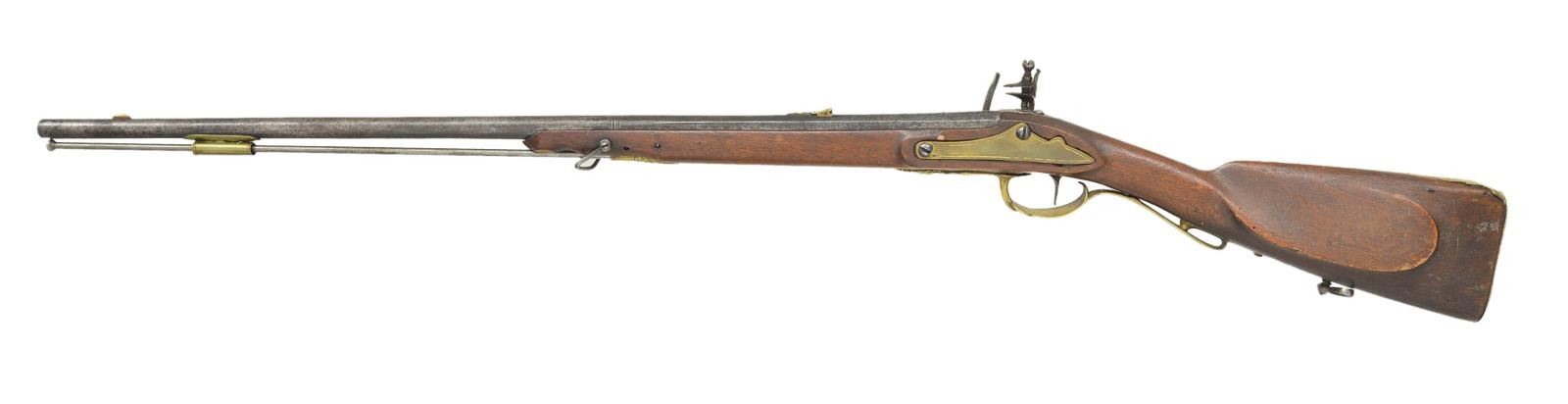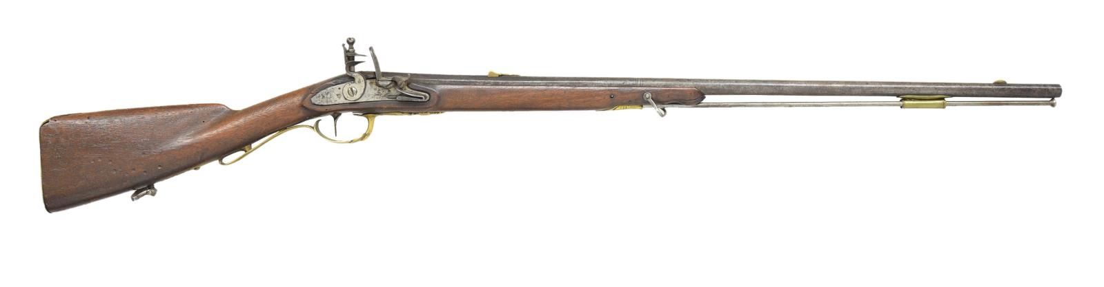 1) EUROPEAN CHILD’S FLINTLOCK FOWLER. Cal. 42. NSN. Bbl. 26 3/4" half rnd., fitted w/ brass rear & front sights & has unknown marks on top flat. Sm. flintlock w/ serpentine cock also features inset faceted pan, unbridled frizzen & friction spring w/ spear finial. Sm. sized walnut half stock (10 3/4" LOP) is mounted w/ relief brass trigger guard, heavy sideplate & buttplate. Stock also features swept right hand cheekpiece & sling loops. Steel ramrod mounts through single brass pipe soldered to bottom of bbl. & thimble. CONDITION: bbl. dark brown patina w/ silver highlights. Lock w/ extensive cleaning is mostly pewter gray. Bbl. & lock appear to be in original flintlock configuration. Stock retains old finish w/ a number of light & deep marks. Lock is operable. Rusted bore. (01-19767/MGM).