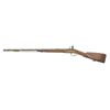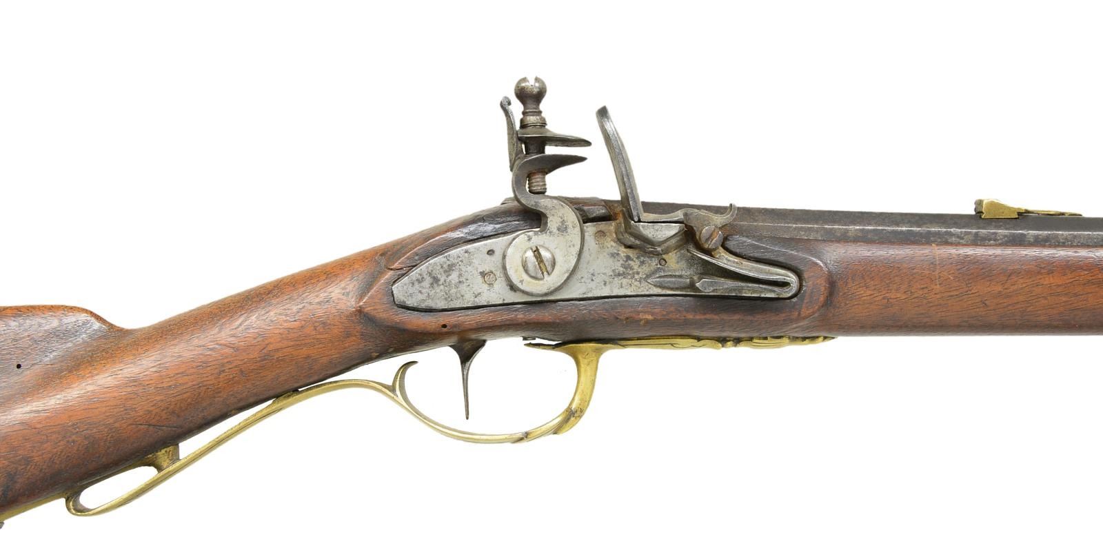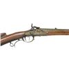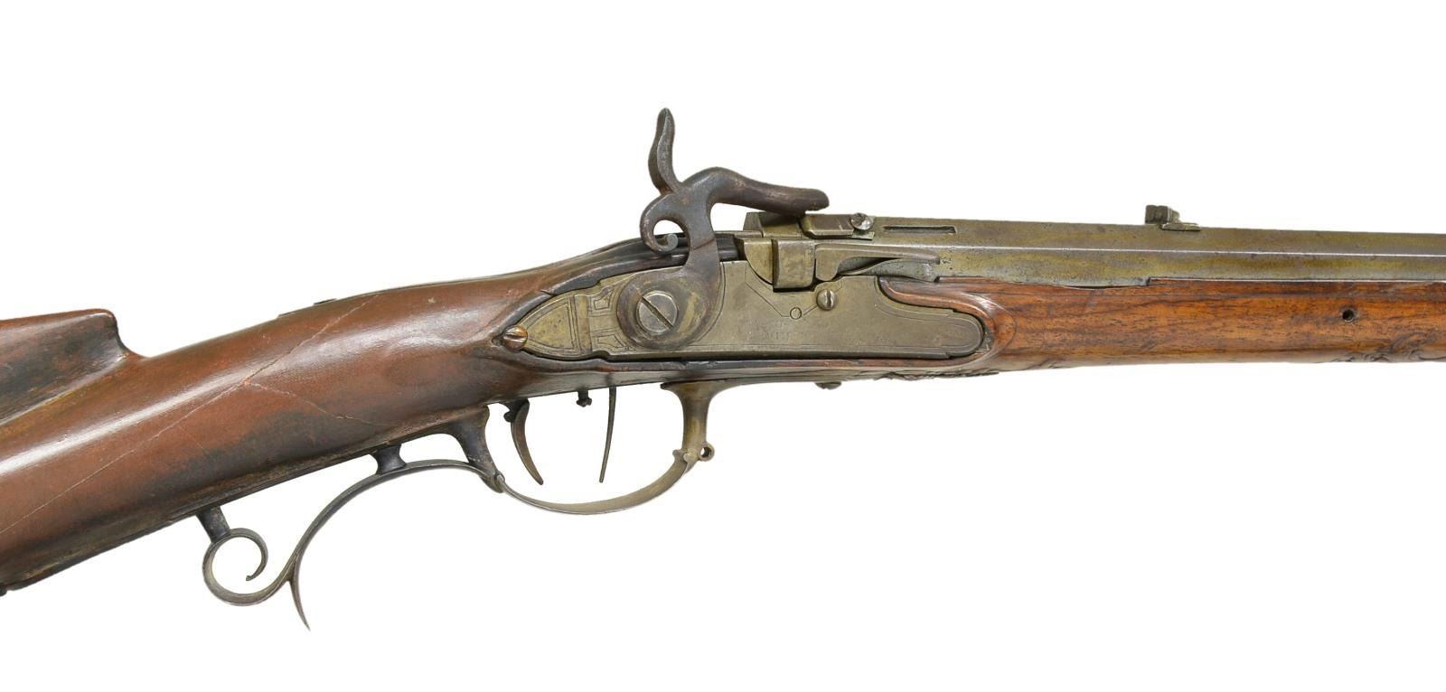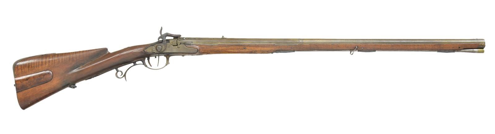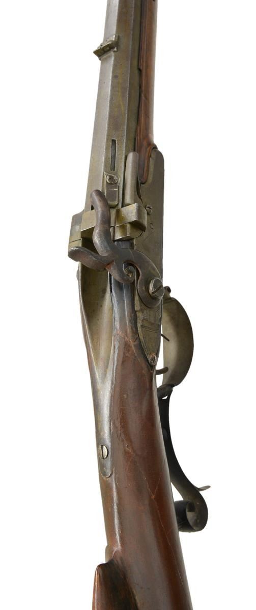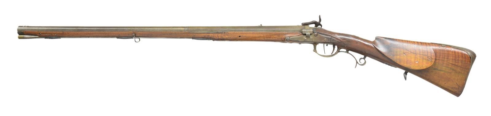 2) INTERESTING FULL STOCK GERMANIC RIFLE CONVERTED TO PINFIRE BREECH LOADER. Cal. 60. NSN. Bbl. 30". This early, high quality rifle has 30" oct. to rnd. bbl. which is very finely swamped between wedding band transition & muzzle. Pinfire conversion was done by fitting a special breechblock that pivots into recess at right & held by a thumb actuated catch. Block pivots on left side above deeply chamfered sideplate. Lock w/ matching plate has remnants of maker’s name & is fitted w/ unusual percussion type hammer w/ long extended nose to engage pinfire cartridge base. Breech iron is deeply cut away to allow loading. Germanic style full stock w/ wooden sliding patch box cover on right, extended to muzzle w/ horn cap. There are raised carved beads along bbl. & ramrod channels & nicely relief carved acanthus motifs behind thimble & in front of trigger guard finial. Stock is brass mounted w/ high relief trigger guard having scrolled grip & heavy buttplate engraved w/ family crest on tang. CONDITION: iron parts exhibit gray to brown patina over light pitting. Stock w/ some old, possibly original finish has extensive repairs at wrist. Brass furniture is nicely toned. Bore is good to very good w/ strong rifling, dark, but may clean. Lock is slip hammered. Set triggers work. PROVENANCE: The Estate Collection of Gary Parietti. (01-19768/MGM). BOTH ANTIQUE. $600-900.