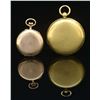 The 18k gold English pocket watch weights 49.8 dwt (includes movement). The Swiss pocket watch;14k 18.7 dwt (including movement). Neither movement is running. CONDITION: both hunter cases cover work properly. Both cases are in very good condition. (05-880-9/JGS). $800-1,000.