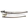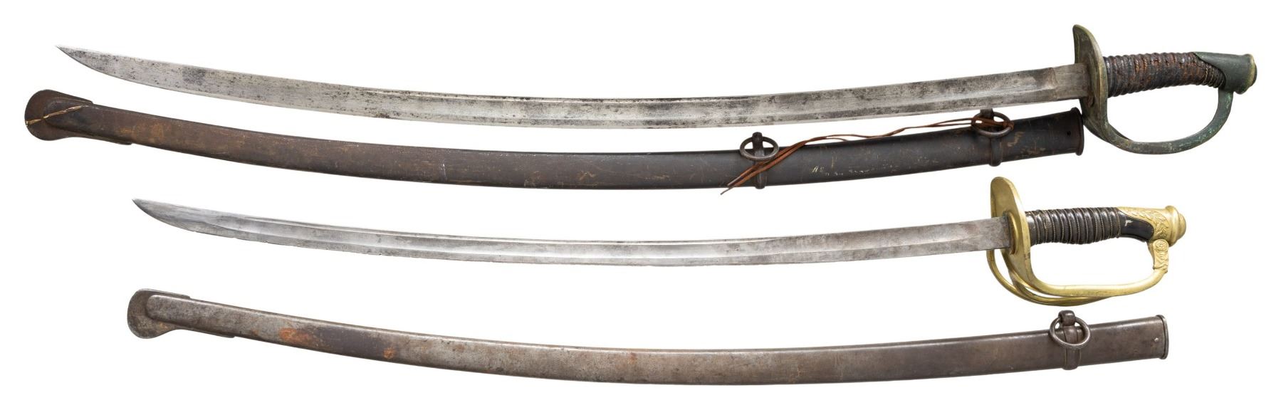 1) A cavalry officer's saber measuring 43 1/2" overall with a plain 30 1/2" shortened blade. Brass hilt with embellished quillon, branches, pommel and top of the knuckle bow. Wire wrapped horn grip. Single suspension loop scabbard. CONDITION: blade has been shortened and sharpened. Hilt and scabbard show light wear. 2) An enlisted US M1840 style saber measuring 43 1/2 inches overall with a plain 36" blade that is void of makers marks. Plain brass two branch hilt and a wire wrapped leather grip. Iron scabbard. CONDITION: blade has a gray patina and has been sharpened. Hilt has a dark patina with verdigris. Grip leather is worn and wire is only 15% complete. (02-24165/BF). NON-GUN. $400-600.