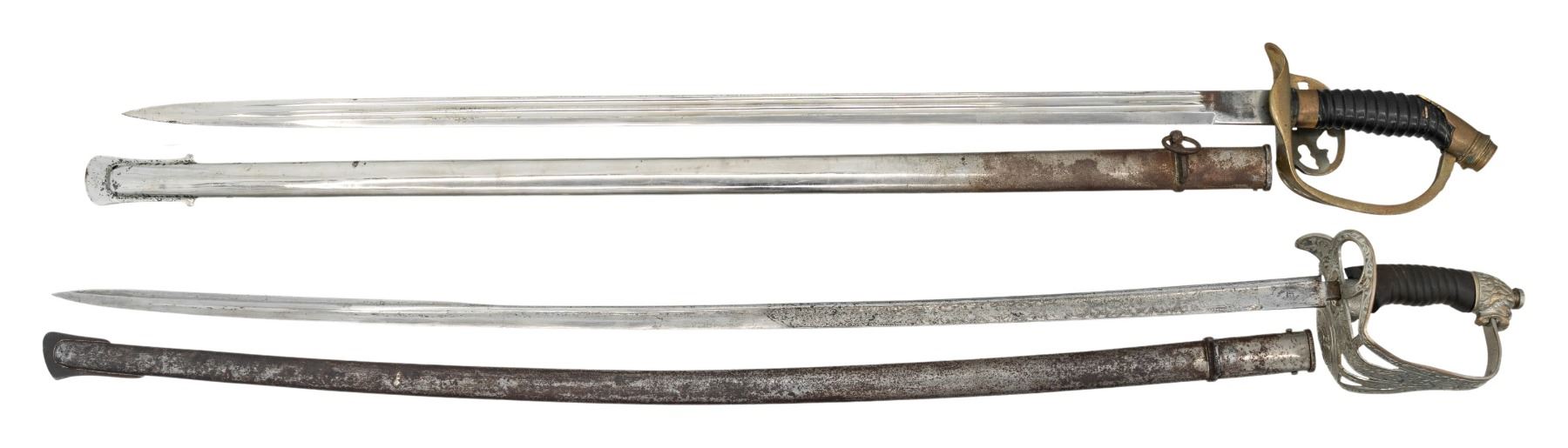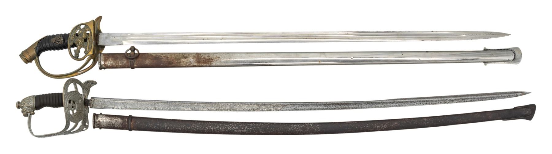 1) A Russian or Eastern European sword measuring 39" overall with an etched pipe back blade having cyrillic markings near the hilt. Etched decoration is primarily foliate motifs. The semi-basket non-ferrous hilt features a 2-headed eagle cutout decorating the guard and 3 branches joining the knuckle bow. Lion head pommel with composite grip with a plated iron scabbard. CONDITION: blade has a gray patina with minor pitting. Hilt is misshaped and the grip is broken. Scabbard has lost most of its plating. 2) An Imperial German sword likely from Prussia measuring 38 1/2" overall with a plain unmarked double fullered blade. Brass hilt with afolding eagle guard featuring a Prussian eagle. Canted grip with a royal cipher on the front. Iron scabbard. CONDITION: blade shows ample original factory polish and the guard shows light wear. Scabbard has areas of plating loss. (02-26133/BF). NON-GUN. $200-400.