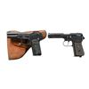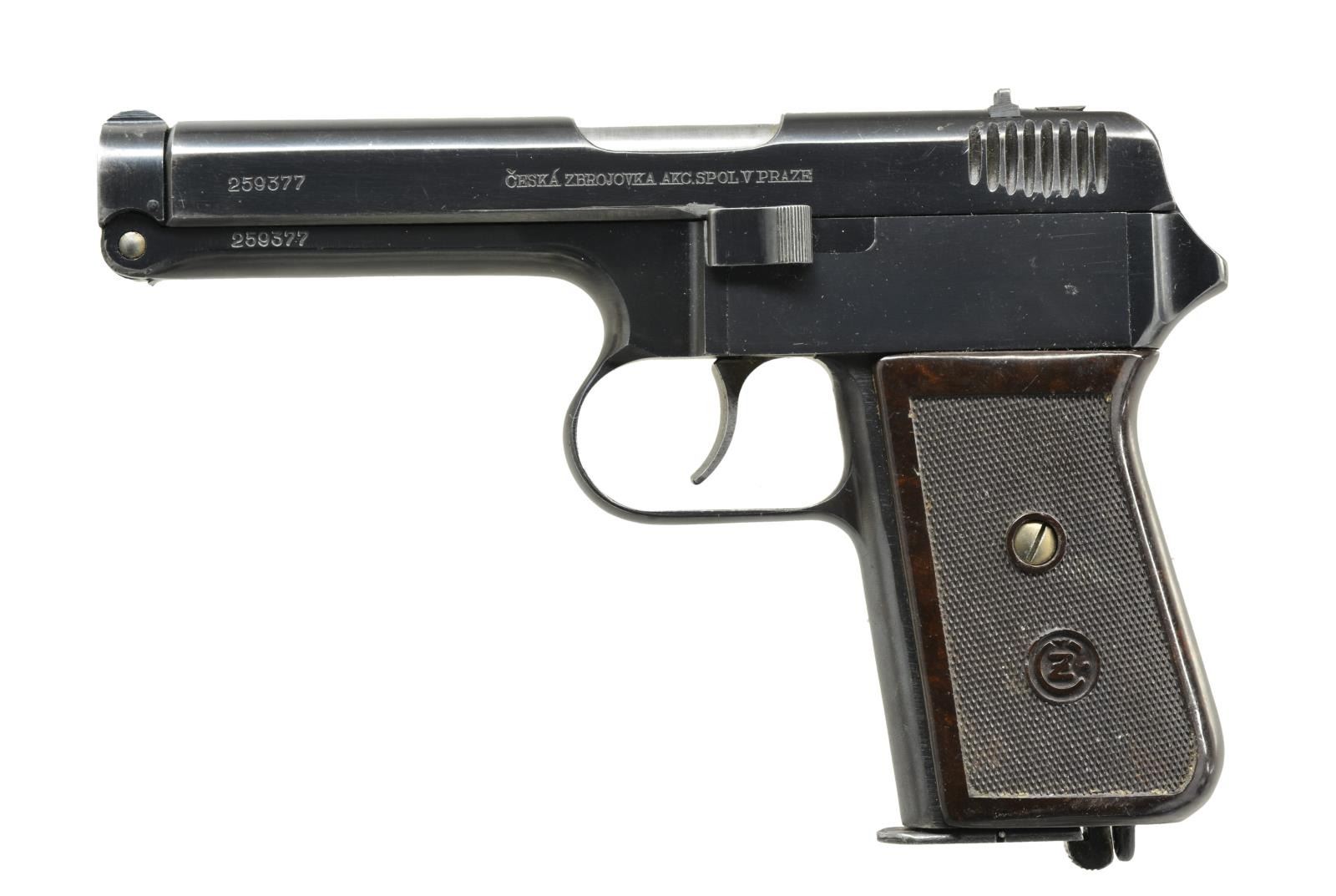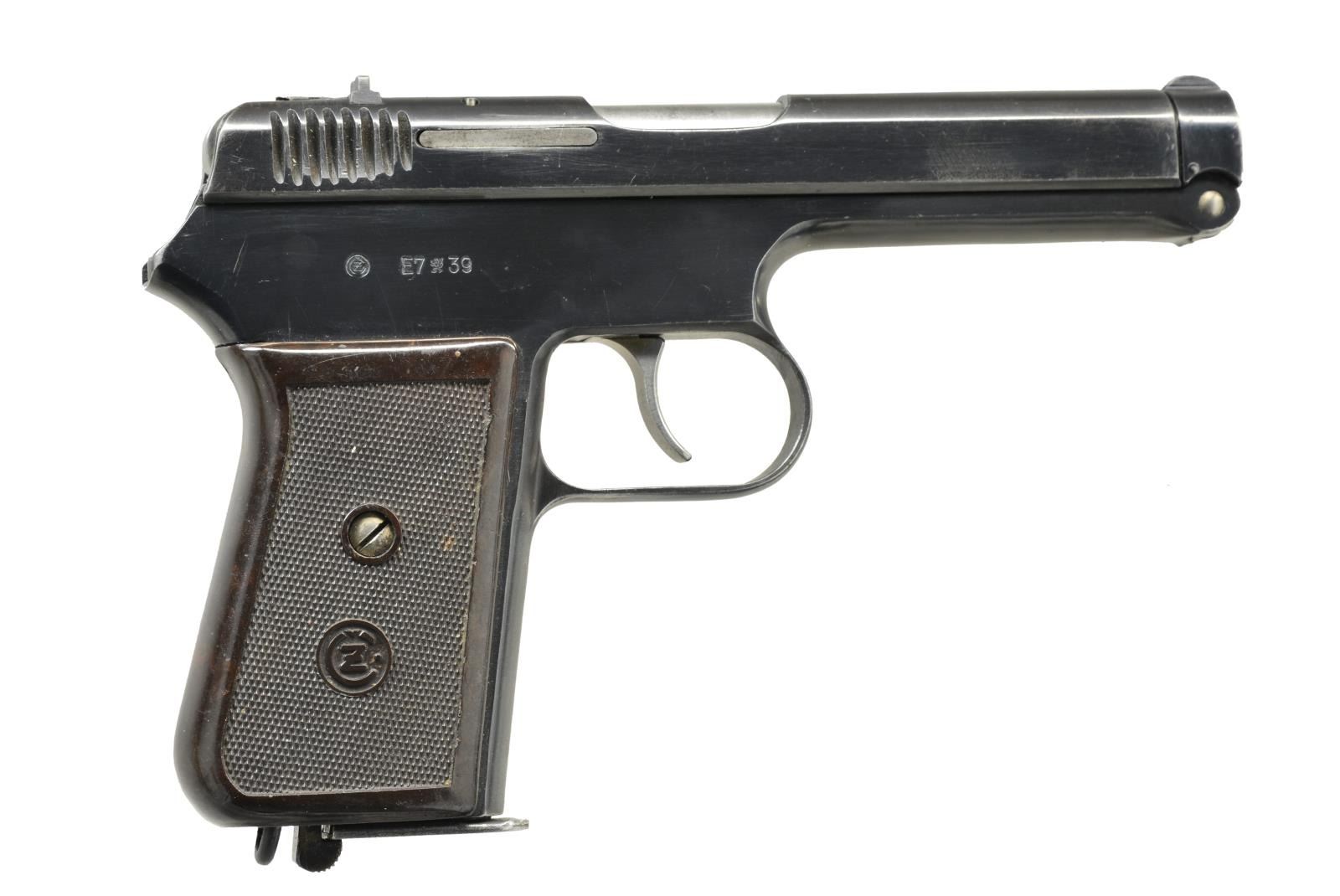 2) CZ MODEL VZ 38. Cal. 380 ACP. S#. 259377. Bbl. 4 3/4". Mfg. 1938-1939. Matching numbered slide having drift adj. rear sight; front sight blade on bbl. retainer. Blued finish mag. release at butt. Right side of frame has CZ logo plus "E7" w/ lion proof then "39". Checkered CZ logo brown checkered bakelite grips. Straw colored ring hammer, firing pin retainer & trigger. Very unusual slide release for field stripping. DAO functioning; popular today unusual in 1930's. MAGS: 1 good factory 9 rd. CONDITION: very good appearance w/ slight frontal high point wear & hint of beginning patina on front strap. Light rub mark from disassembly latch. Very good bore. (21-2594/NW). BOTH CURIO. $900-1,400.