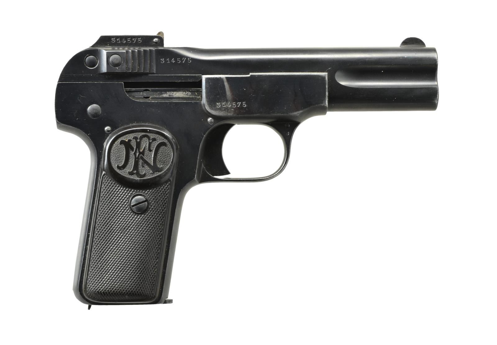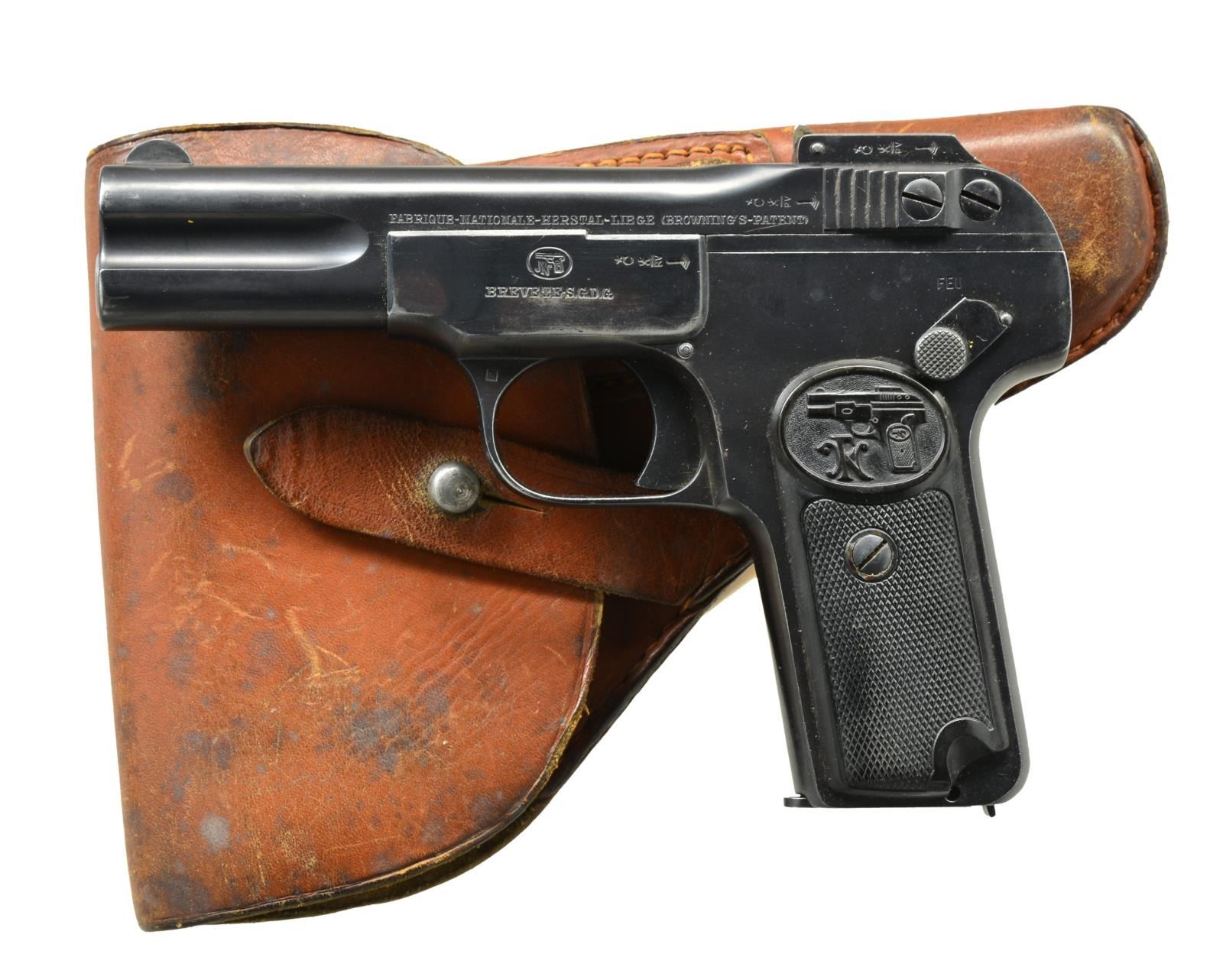 1) FN MODEL 1900. Cal. 32 ACP. S# 314575. Bbl. 4". Mfg. 1900-1914 (724,500 units) w/ French safety markings. Matching numbered frame, slide & breech block. Black checkered hard rubber grips w/ FN logo on right & pistol image on left; also relieved for lanyard (loop missing). MAGS: 2 very good factory 7 rd. w/ slightly different shaped bases numbered 314575/2 (matching #2 mag.) & 122829/1. UNATTACHED ACCESSORIES: good light brown flap holster w/ stud & strap retention. Single wide belt loop & mag. pouch. Underside of flap neatly inked "R. Leonhardt". Light wear & patina on front; better appearing back. CONDITION: very good overall appearance w/ holster like high point wear. Very good grips & bore having slight wear & sm. marks. (21-2590/NW).
