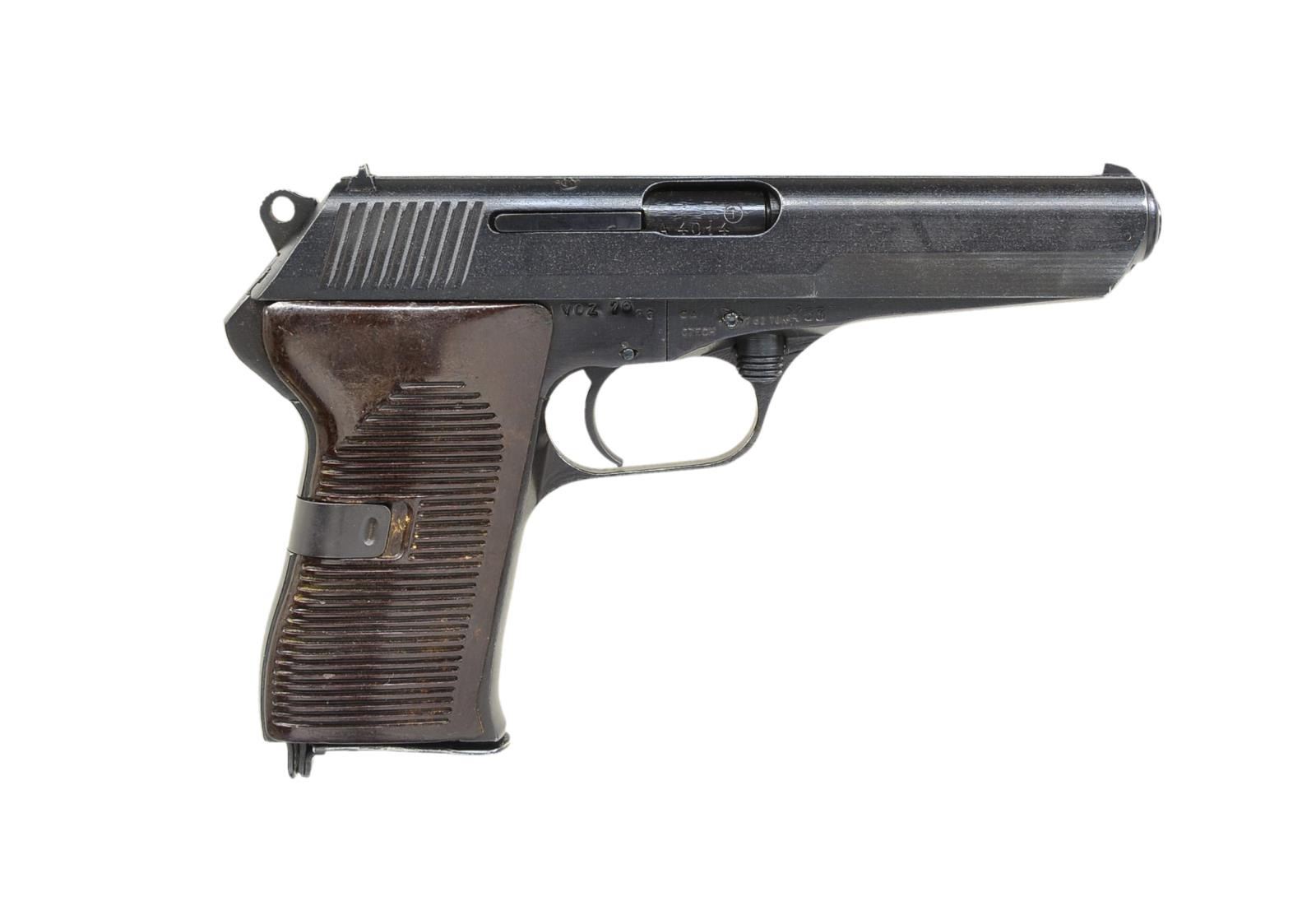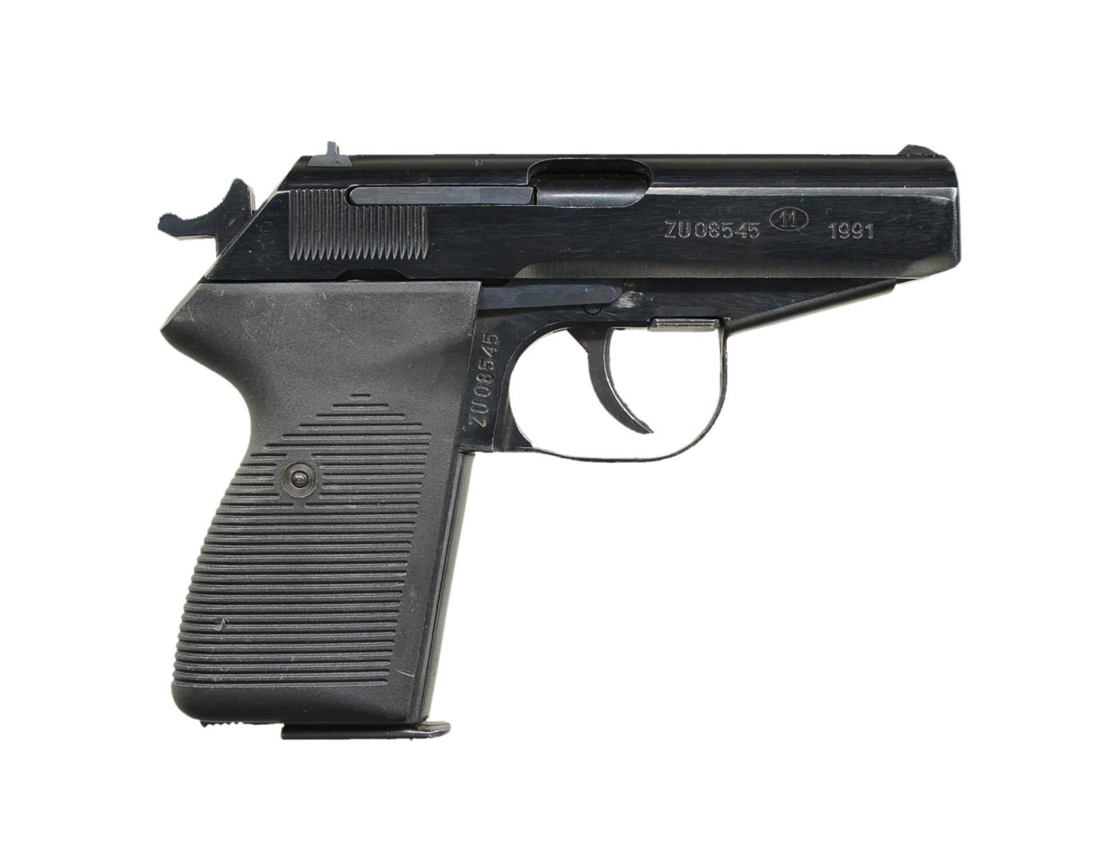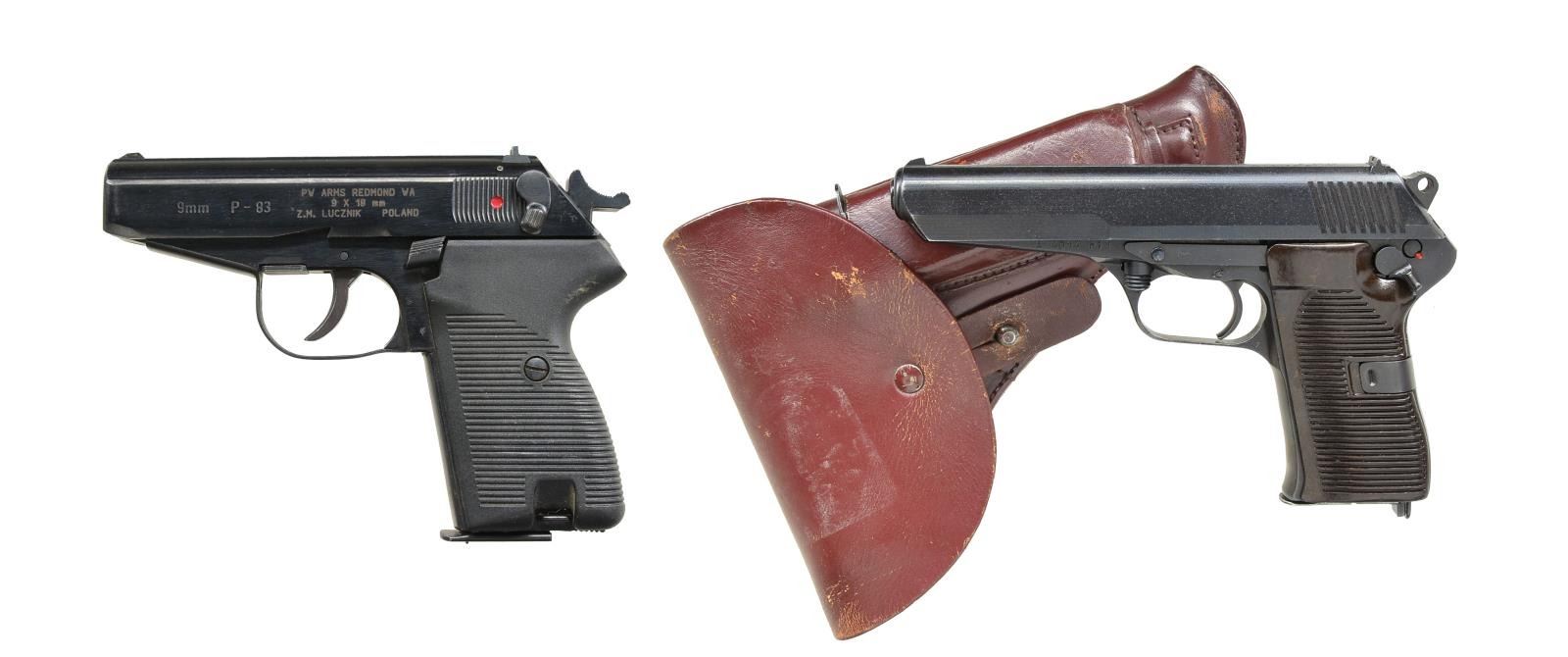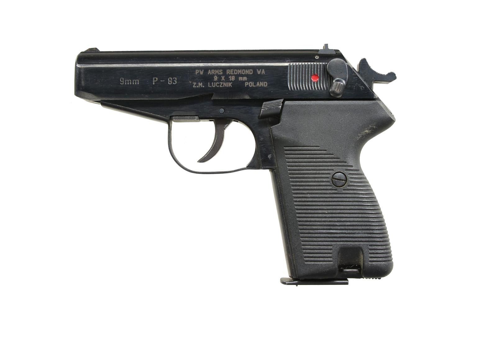 1) LUCNIK MODEL P-83. Cal. 9x18 (9mm Makarov). S# ZU08545. Bbl. 3.6". Mfg. 1991 in Poland. Matching numbered slide having raised rib w/ dovetailed rear sight; fixed front. Horizontally grooved plastic grips. DA functioning w/ slide mounted safety. PW Arms marked slide. MAGS: 1 Matching numbered 8 rd. CONDITION: overall appearance very good to near excellent w/ near excellent grips & bore. (21-1732/NW). MODERN.