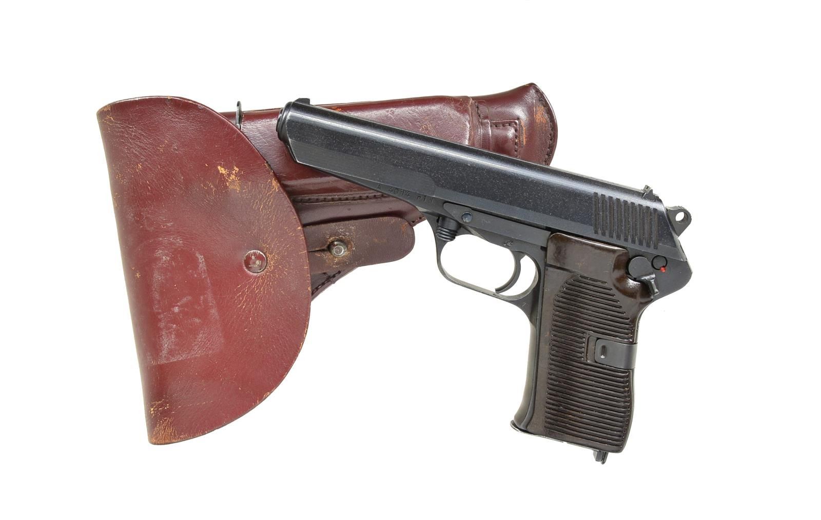 2) CZ MODEL 52. Cal. 7.62x25. S# A 4014. Bbl. 4.9". Mfg. 1953 w/ matte finish & horizontally grooved brown plastic grips. Frame has CAI import marks plus "VOZ 70". Import compliant, thumb mounted safety. MAGS: 2 factory 8 rd. UNATTACHED ACCESSORIES: very good cordovan brown flap holster w/ cleaning rod; no markings. CONDITION: very faint high point thinning on slide; all other aspects near excellent including bore. (21-1789/NW). CURIO. $450-600.