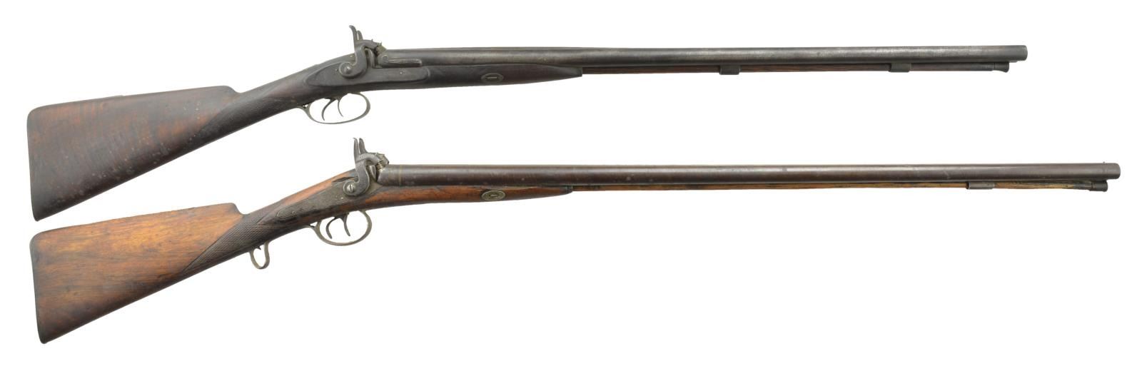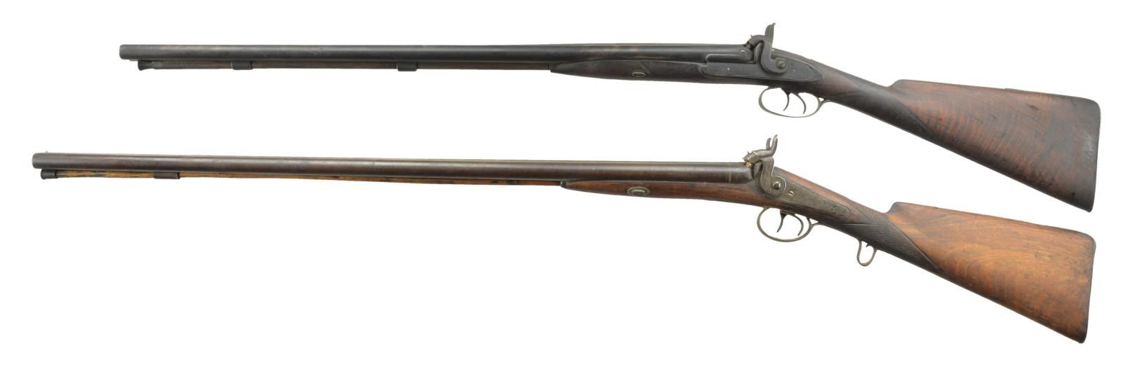 2) Cal. 12 Ga. NSN. Bbls. 33" w/ brass bead, platinum band at breech & rib. Full chokes. Back action island locks w/ scroll engraving. Dbl. triggers. Wedge fastened Hardwood buttstock w/ checkered wrist. Iron engraved thimble, engraved finger grip trigger guard w/ spear finial & buttplate. German silver wedge escutcheons. Hardwood ramrod held by single pipe. CONDITION: fair metal turned black & brown patina w/ marks, oxidation & pitting. Fair worn wood finish w/ repaired break at comb through wrist along w/ lg. chip at right lock plate, moderate marks & sm. cracks throughout. Dark pitted bores. (01-20880/MD). ALL ANTIQUE. $125-200.