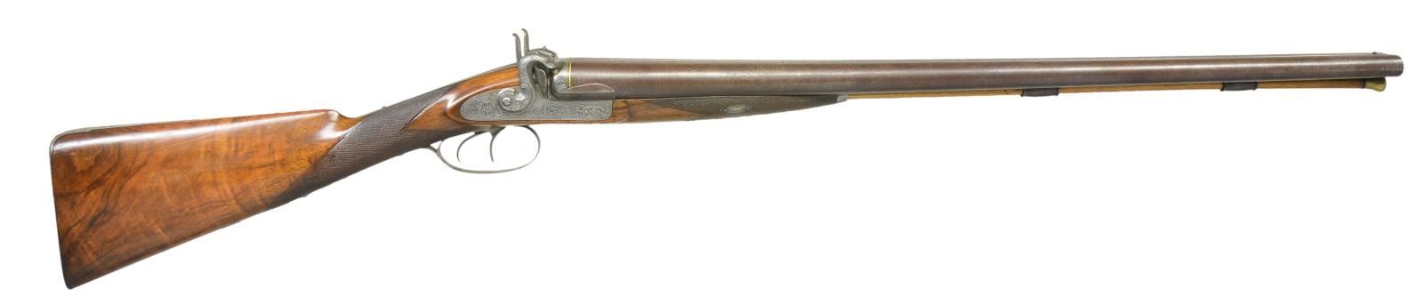 1) BELGIAN. Cal. 10 Ga. S# 2942. The "Warranted Laminated Steel" 29 1/2" bbls. have gold inlaid rib marking, single bands & brass bead. Matching numbered hammer sidelocks w/ floral scroll engraving that extends to serpentine hammers, breech end, triggerguard, top tang, thimble & buttplate tang. Matching numbered, wedge fastened straight grip stock w/ checkering at forearm & wrist & brass shield on toeline. Hardwood ramrod w/ brass tip & patch jag held by 2 faceted pipes. CONDITION: bbls. have good brown finish showing areas of fading, patina around muzzle & pinprick oxidation. Other metal shows gray patina appearance w/ light pinprick oxidation. Sanded & refinished wood has varnish on some metal parts along w/ scratches & marks. Good bores. (01-21744/MD).