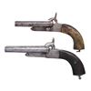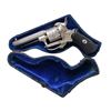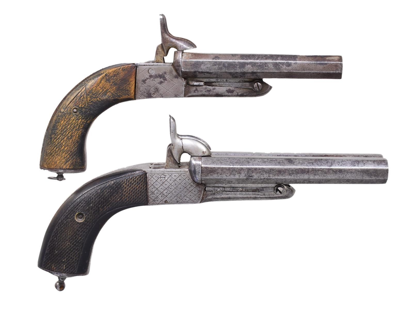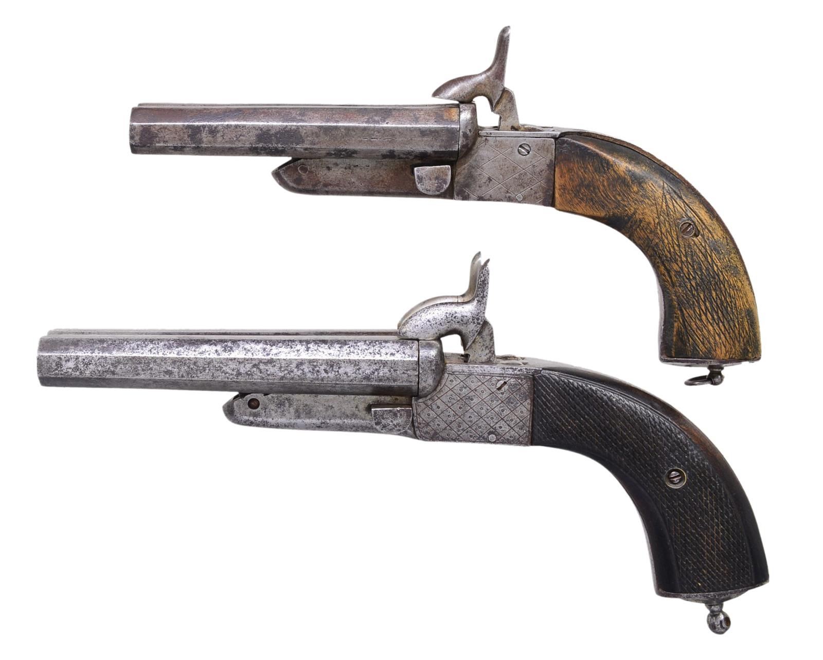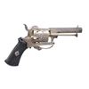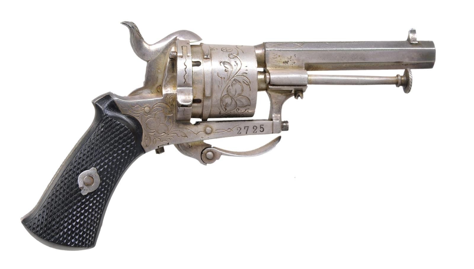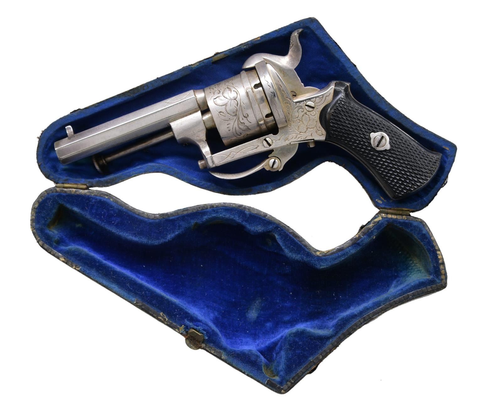 DA REVOLVER. 1) EUROPEAN SXS PINFIRE PISTOL. Cal. 15mm Pinfire. S# 8. Bbls. 5 1/2" oct. Boxlock action w/ center mounted hammers & folding triggers having line & dot engraving. Left side mounted push button release lever allowing bbls. to tip forward for loading. 2 Piece checkered walnut grips w/ lanyard ring at butt. Weight: 1 lb., 15 oz. CONDITION: cleaned gray metal showing general light pitting. Right hammer is broken & repaired at neck. Grips have age darkened appearance showing moderate wear. Good mechanics. Dark bore shows scattered pitting. (01-18466/DS). 2) EUROPEAN SXS PINFIRE PISTOL. Cal 5mm Pinfire. NSN. Bbls. 4 11/16" oct. Boxlock action w/ center mounted hammers & folding triggers. Left side mounted lever allows bbls. to tip forward for loading. 2 Piece checkered walnut grips w/ lanyard ring at butt. Weight: 1 lb., 3.5 oz. CONDITION: cleaned metal showing scattered spots of pitting & corrosion. Grips show heavy wear & do not fit well at action. Dark pitted bores. Left hammer will not hold in cocked position. (01-18467/DS). 3) BELGIAN PINFIRE DA REVOLVER. Cal. 5.5mm Pinfire. S# 2725. Bbl. 2 5/16" oct. 6 Shot rnd. cyl. Silver finished action w/ spur trigger having floral pattern engraving. 2 Piece checkered hard rubber grips. UNATTACHED ACCESSORIES: molded pressboard case w/ blue interior. Case shows light wear. CONDITION: 90% silver finish w/ some areas acquiring a darker tarnish. Grips show light wear. Sound mechanics. Bore retains sound rifling. (01-18471/DS). ALL ANTIQUE. $900-1,400.