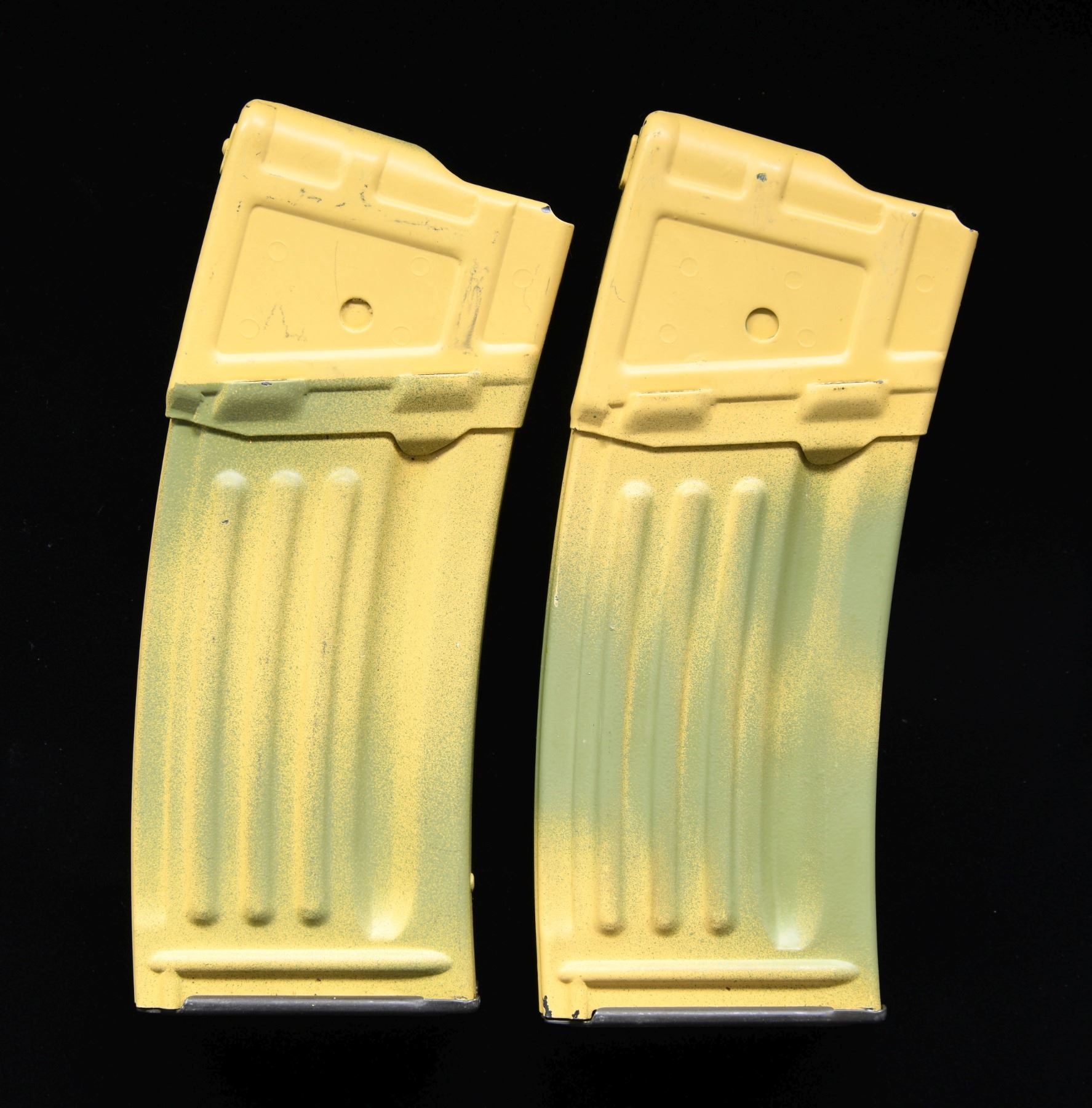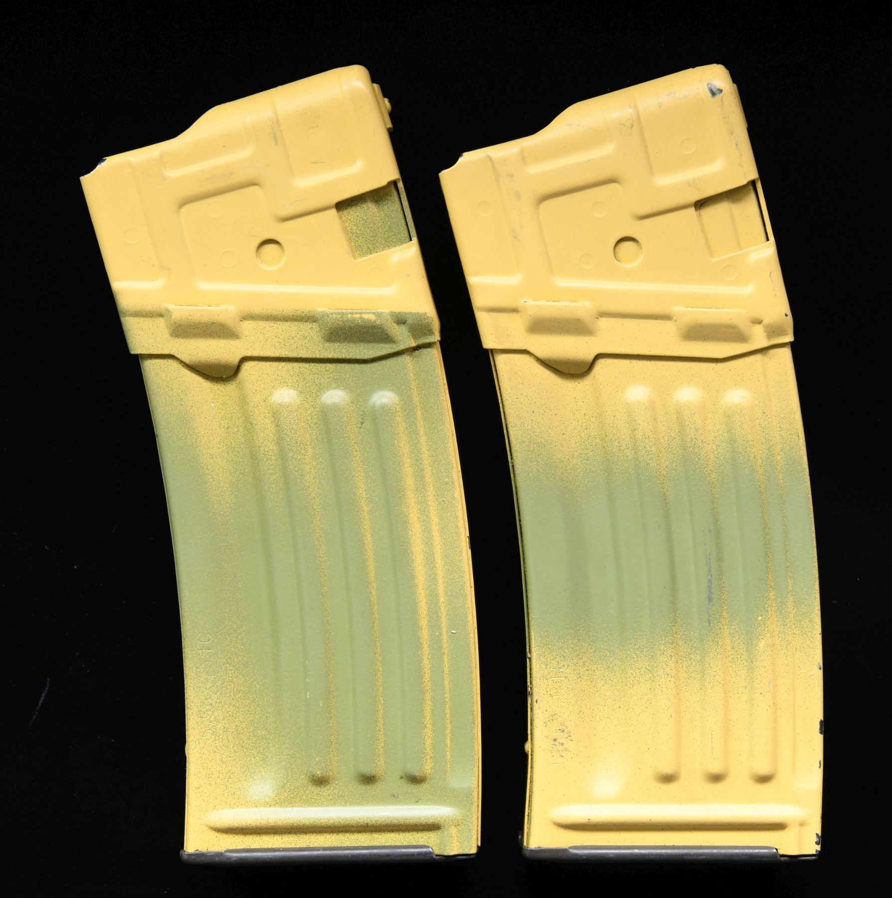 MAGAZINES. 2 extremely rare 25 rd. magazines for a very limited offering of HK rifles manufactured in 1988 w/ a factory camo pattern. Less than 300 of these rifles were manufactured, making matching accessories extremely hard to find. These mags have the "Desert Camo" pattern and are for the HK Model 93 series, chambered in .223. CONDITION: The finish on these magazines is complete & consistent w/ only a few tiny spots of flaking and very gentle thinning from mechanical intervention from being inserted in a rifle. The followers show no sign of prior use. (02-24313/JZ). MODERN. $300-600.