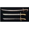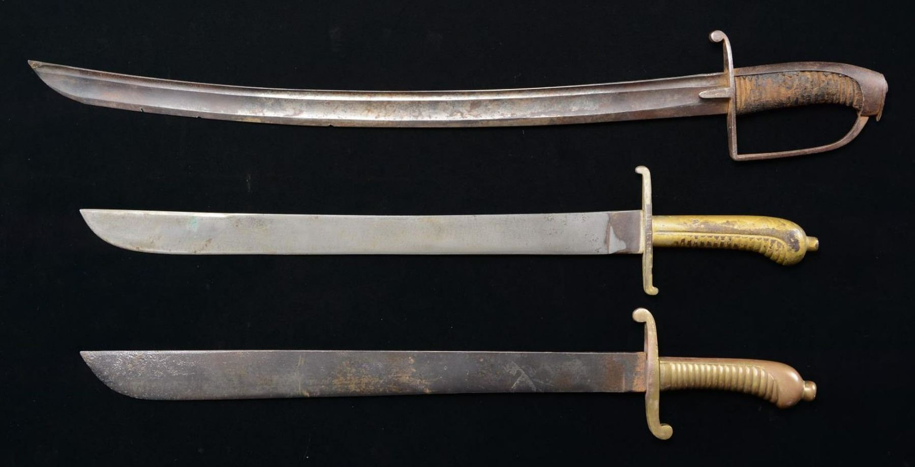 SWORDS & 1 CUT-DOWN CAVALRY SABER. 1) M1845. Overall length: 24 1/2". Blade length: 18 1/2". Plain blade stamped at the ricasso w/ a knight’s head on one side & a crowned cipher on the other. Solid brass hilt w/ horizontally ribbed grip. CONDITION: blade has a dark overall patina w/ some slight pitting at the tip. Hilt has a pleasing patina. No scabbard. 2) M1845. A later incarnation of the M1845 w/ an overall length of 24 1/2" & a blade length 18 1/2". Plain blade w/ no markings. Crossguard is stamped “I19 . R.6.II”. Solid iron hilt w/ a gold painted finish. Horizontally ribbed grip. No scabbard. CONDITION: blade has a light gray, cleaned finish. Hilt retains 70% of its painted finish. 3) SHORT SABER. An early 1800s cavalry saber measuring 28” overall w/ a blade that has been shortened to 22 3/4". Plain blade w/ a single wide fuller & a secondary fuller near the spine. Iron D-guard hilt w/ plain pommel & backstrap. Narrow languets on each side. Leather covered wood grip. No scabbard. CONDITION: blade has a dark overall patina, as does the hilt. Grip leather is about 35%. No wire. (02-21232-2/BF). $350-500.