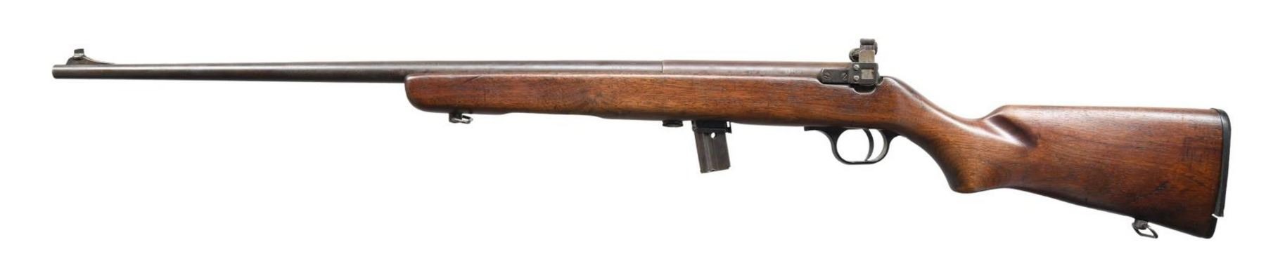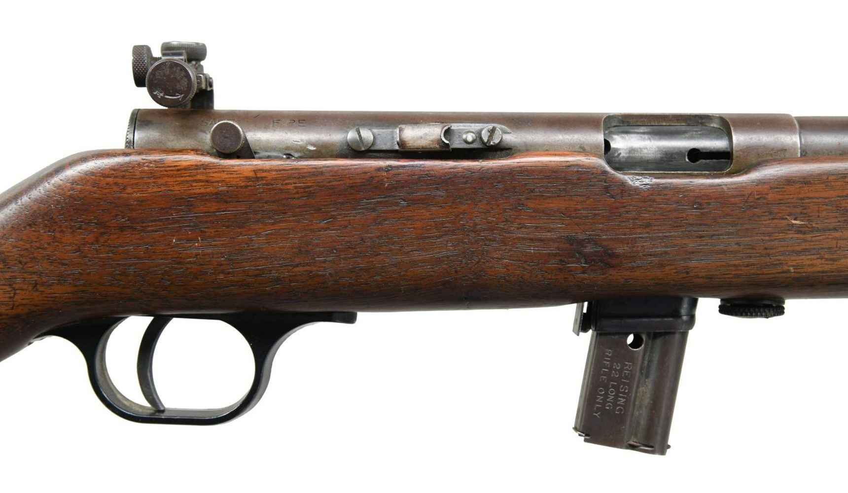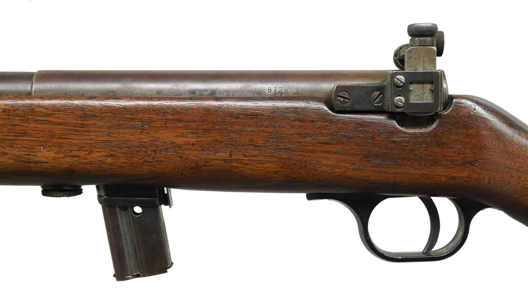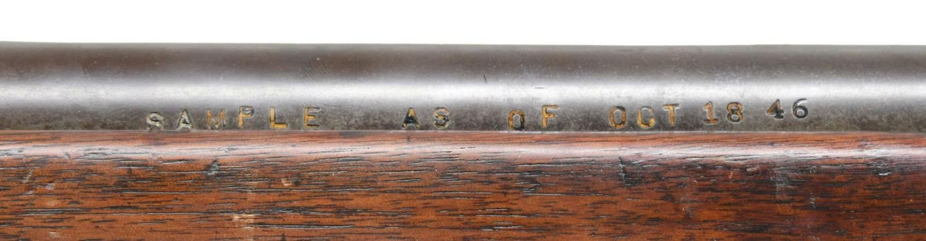 RIFLES. ALL: Cal. 22 LR. Bbl 23". Model 165 "Leatherneck" semi-automatic rifles manufactured by Harrington & Richardson. The left side of the bbls. are marked " "LEATHERNECK" " over the model and cal. designations. Top of receivers exhibits H&R's address, with the serial number on the left. 1) S# 6728. The right side of the bbl. exhibits an unusual "SAMPLE AS OF OCT 18 46" stamp, possibly indicating use as a military or commercial sales sample. Metal components exhibit a blued finish. 1 piece wood buttstock with black plastic trigger guard (front trigger guard screw is missing). Ramped blade front sight with side mounted adjustable aperture rear sight. Magazine release extension is not present. MAGS: 1 10 rnd. CONDITION: metal components exhibit heavy wear overall, with the balance retaining an even brown patina overall, showing some concentrated spots of mild pitting. Mirror bore, exhibiting well defined rifling throughout. Stock exhibits scattered marks and minor impressions from storage and handling, with a light crack on the left side of the wrist stemming from the trigger guard. Buttplate is broken just above the bottom screw. (23-4715/MLW). 2) S# 1510. Bbl 23". Blued finish with 1 piece plain wood buttstock. Aluminum trigger guard (both trigger guard screws are not present). Ramped blade front sight, with Redfield adjustable aperture rear sight. Buttplate is not present. MAGS: 1 aftermarket 20 rnd. CONDITION: metal components retain good amounts of their original factory blue finish, exhibiting wear and thinning overall that shows through to a brown patina, with some scattered spots of oxidation. Mirror bore, exhibiting well defined rifling throughout. Stock shows some scattered marks from handling and storage, but otherwise is very good overall. (23-4718/MLW). ALL CURIO. $300-500.