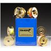 SPOOLS. 1) Fin-Nor #1 direct drive (left hand wind) with 1 extra spool with lines. CONDITION: very fine. Overall clean with some knicks on right base. 2) #1 Anti-reverse (right hand wind) with backing and 3 extra spools without lines. CONDITION: very fine with some light scratches. Extra spools excellent; one with backing. All in blue box for anti-reverse reel containing spare parts, bag and paperwork. PROVENANCE: From the Private Collection of Berrien Moore III. (02-25870-3/MGM). $600-1,200.