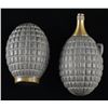 These 1lb. 10 oz. grenades are similar to many "pineapple" style grenades w/ Farsi markings on body that are believed to be translated as "Type 2 Infantry Grenade". Body has a 3" diameter & 4" length. Both have brass caps, 1 is sealed. One grenade has cast notch for carrying in ring. CONDITION: 1 grenade has sm. hole on bottom, otherwise both grenades are intact & good condition w/ patina on sealed cap. Cap for other grenade appears replacement. (02-16272-1/MD). $500-700.