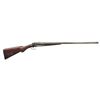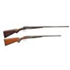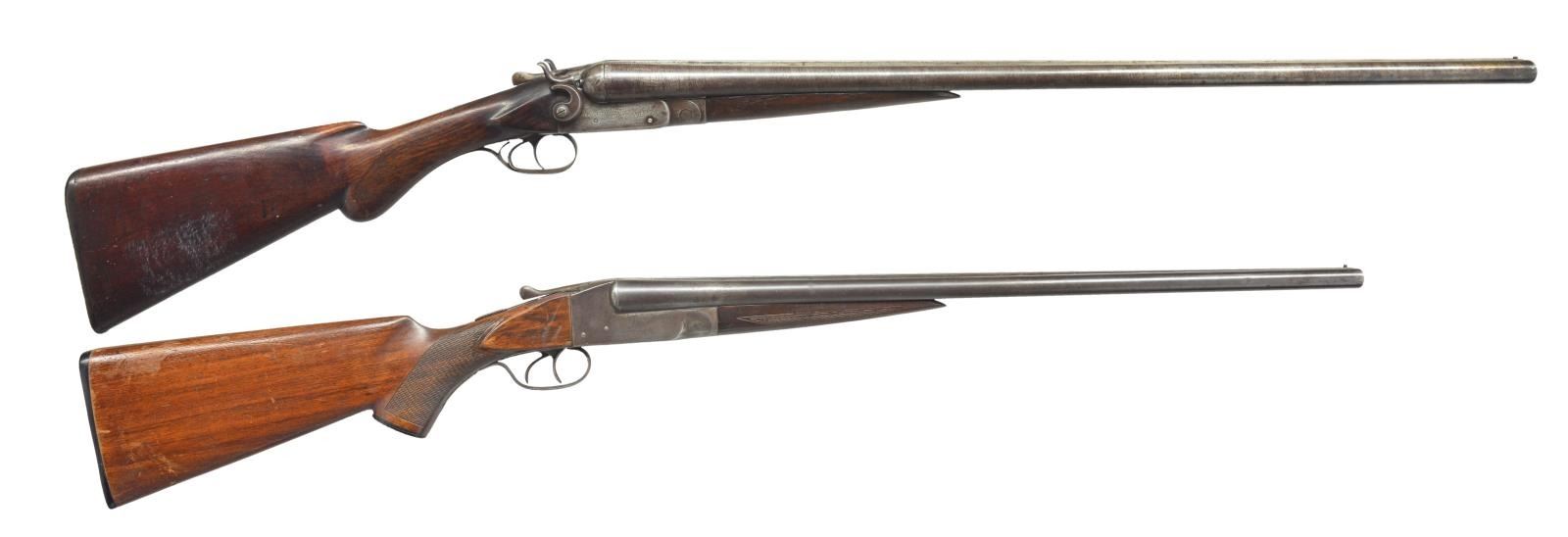 1) GRADE A HAMMER. Cal. 12 Ga., 2 5/8". S# 31835. Bbls. 30" of Twist steel w/ fixed Mod. & Full chokes. Exposed hammer boxlock top lever action w/ dbl. triggers & extractors. Banners on receiver marked "NEW ITHACA GUN". Splinter forearm & rnd. knob stock of checkered walnut. LOP: 13 7/8" over original buttplate. CONDITION: metal finish has faded to a light gray brown patina showing spots of corrosion. Wood has dark worn appearance w/ smooth checkering showing dents & handling marks. Bbls. are loose on frame. Heavily pitted bores. Functioning action. (21-1331/DS). 2) FLUES MODEL FIELD GRADE. Cal. 20 Ga., 2 5/8". S# 192583. Smokeless powder steel bbls. shortened to 24 1/8" w/ cyl. bores. Brass bead. Top lever boxlock action w/ dbl. triggers & extractors. Original checkered walnut splinter forearm. Replacement walnut stock w/ hand checkering, plastic grip cap & Bishop buttplate. CONDITION: bbl. & action finish have faded to a mottled brown patina. Under rib of bbls. between lugs & forearm hangar is resoldered. Right bbl. has a lg. bulge forward of chamber. Left bbl. has dents 6 1/4" & 10 1/2" from muzzle. Bores shows scattered spots of deep pitting. Original forearm has added finish over worn checkering & handling marks. Stock fits poorly at action & has worn finish w/ numerous scratches & marks. (21-1340/DS). ALL CURIO. $400-600.