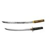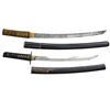 2) Overall length: 25 1/2". Blade length: 18". Blade has an imperceptible hamon. 2 Piece gilded habaki. There is a single seppa and no tsuba. Nakago has a 7 character signature and a single mekugi-ana. Matching gold inlaid fuchi and kashira with tan tsuka-ito. White same. Decorative menuki in a swirl pattern. Black enameled wooden saya. CONDITION: blade has significant staining and oxidation but does not show any edge nicks or delamination. The tsuka shows heavy wear throughout. (02-17582/BF). $600-800.
