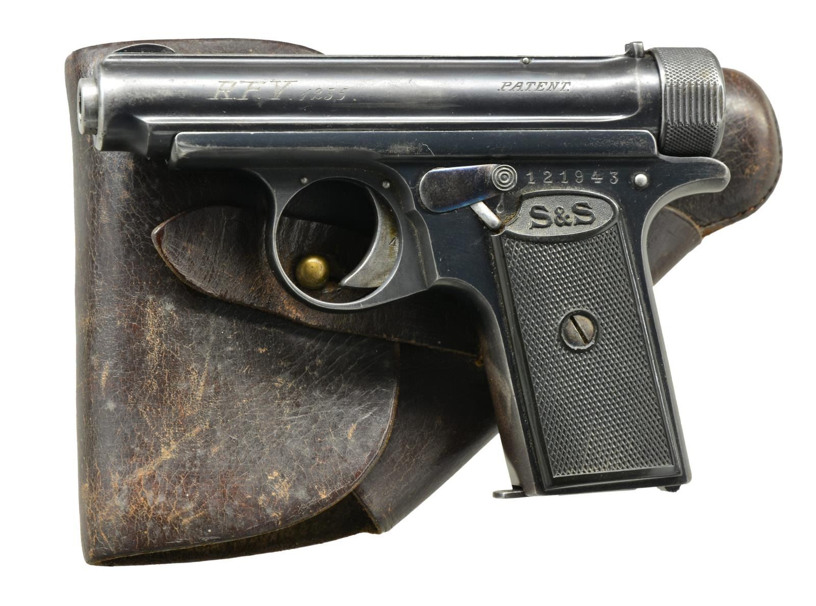 1) SECOND SERIES. R.F.V S# 121943. Rare model used by Reich's Customs & Finance department personnel. Left front of slide marked "R.F.V. 1235". Police variation w/ additional trigger bar safety referred to as Zusatzsicherung by Germans. MAGS: 1 factory 7 rd. w/ sides folded over base marked "S& S Cal. 7,65."; no additional marks or S#. UNATTACHED ACCESSORIES: very good, unmarked sm. brown police style double flap holster w/ spare mag. pouch & wide belt loop; stud & strap retention. CONDITION: good to very good appearance w/ holster like high point wear & faint beginning patina in grip area. Very good grips w/ light hand wear & near excellent bore. (21-2592/NW).