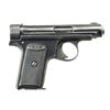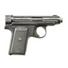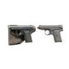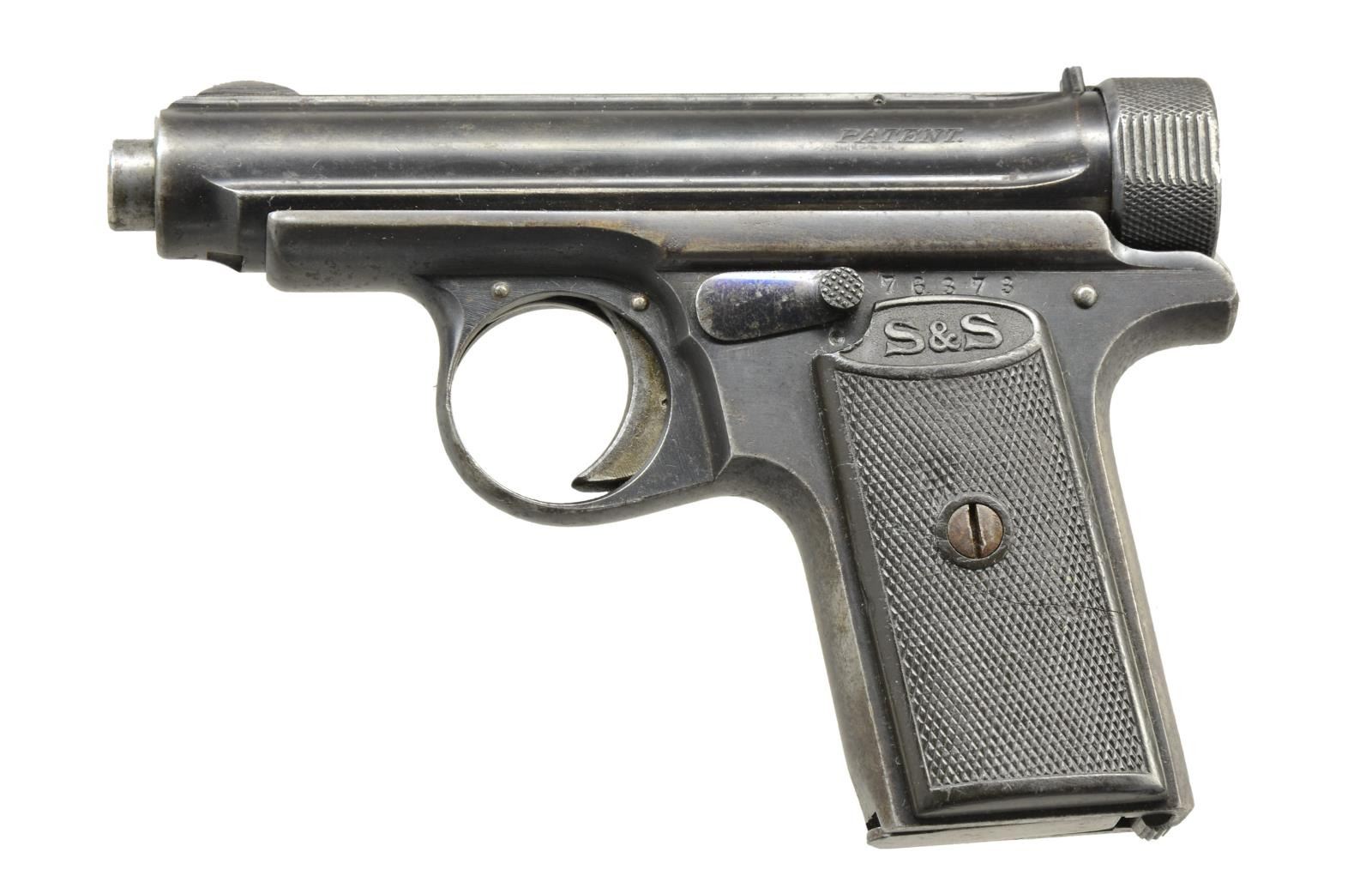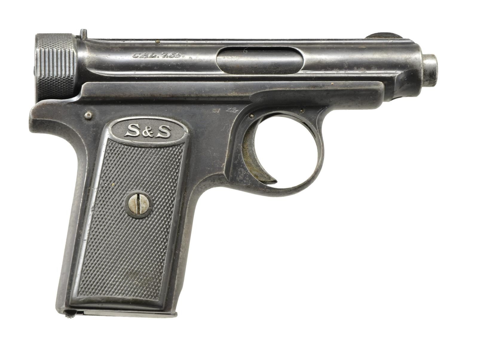 BOTH: cal. 32 ACP. Bbls. 3". Mfg. 1913-1930 w/ checkered hard rubber grips having S& S logos in ovals at tops. Blued finishes w/ fire blue on safety levers & cocking piece retainers. German markings on top of slides having abbreviated blade front sights & notch in cocking piece retainers for rear sights. Mag. releases at base of butts. Commercial models w/ crown N proofs & no military proofs.