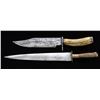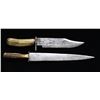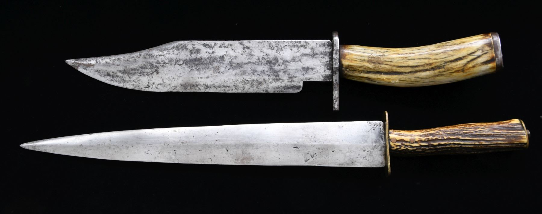 MANUFACTURE. 1) Overall length: 17". Blade length: 10 1/2". Bowie-style blade with a 4 1/2" false edge that is stamped near the hilt on both sides "G . PAY". Iron teardrop shaped guard. Shaped bone grip with iron pommel secured by 6 pins. No sheath. CONDITION: blade has a gray mottled patina with some evidence of pitting. Hilt generally shows light wear and the grip has discoloration and drying cracks. 2) Overall length: 19 1/8". Blade length: 13 3/4". Spear point blade with a raised medial ridge showing a form reminiscent of an "Arkansas Toothpick". Brass rectangular guard with rounded corners. Horn grip secured by two copper pins on each side. Brass pommel with a tang nut at the top. No sheath. CONDITION: blade has a gray patina with some light staining. Guard is heavily tarnished. Grip shows one small drying crack. (02-24310-5/JS). $300-500.