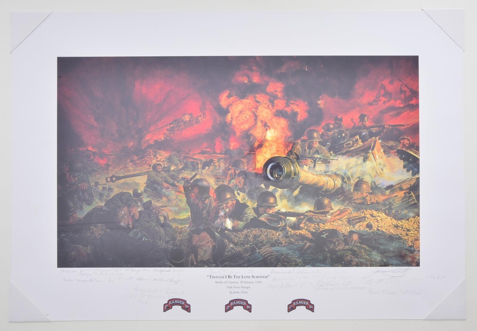 1) THOUGH I BE THE LONE SURVIVOR. A numbered, limited edition print (#66 of 250) depicting the Battle of Cisterna, January 30, 1944. The print measures 20.5"x30" and is mounted on a 30"x40" foam board. It is signed by several Rangers as well as the artist. CONDITION: No visible flaws, wrinkles, tears or fading. Plastic covering foam mounting.