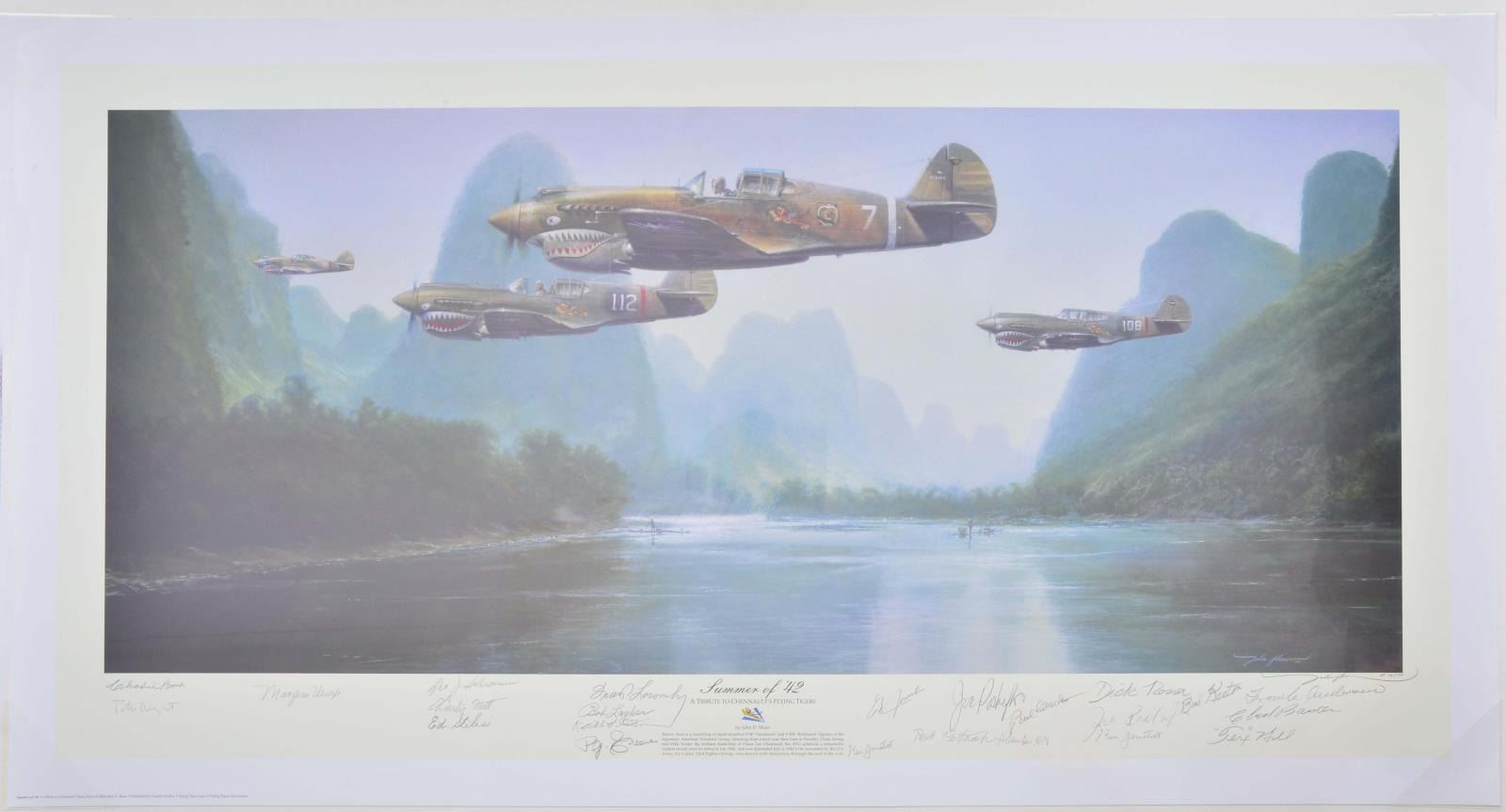2)SUMMER OF 42 - A TRIBUTE TO CHENNAULT'S FLYING TIGERS by John D. Shaw.: A numbered, limited edition print (#16 of 100) depicting P-40 Tomahawk & P-40E Kittyhawk fighters returning from patrol near their base at Kweilin, China in mid 1942, w/ numerous signatures by AVG veterans. Print measures 21"x39.5" and mounted on a foam board measuring 30"x40". CONDITION: No visible flaws, wrinkles, tears or fading. Plastic covering foam mounting. (02-16953-19/JZ). $200-400
