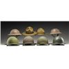 1-2) FKS 20 & HV 559 "doughboy" helmets with liners & chin straps. HV helmet has red & black paint insignia looking like artillery shell. Helmets appears intact with white paint & oxidation. Liners appear intact with 1 chin strap broken.