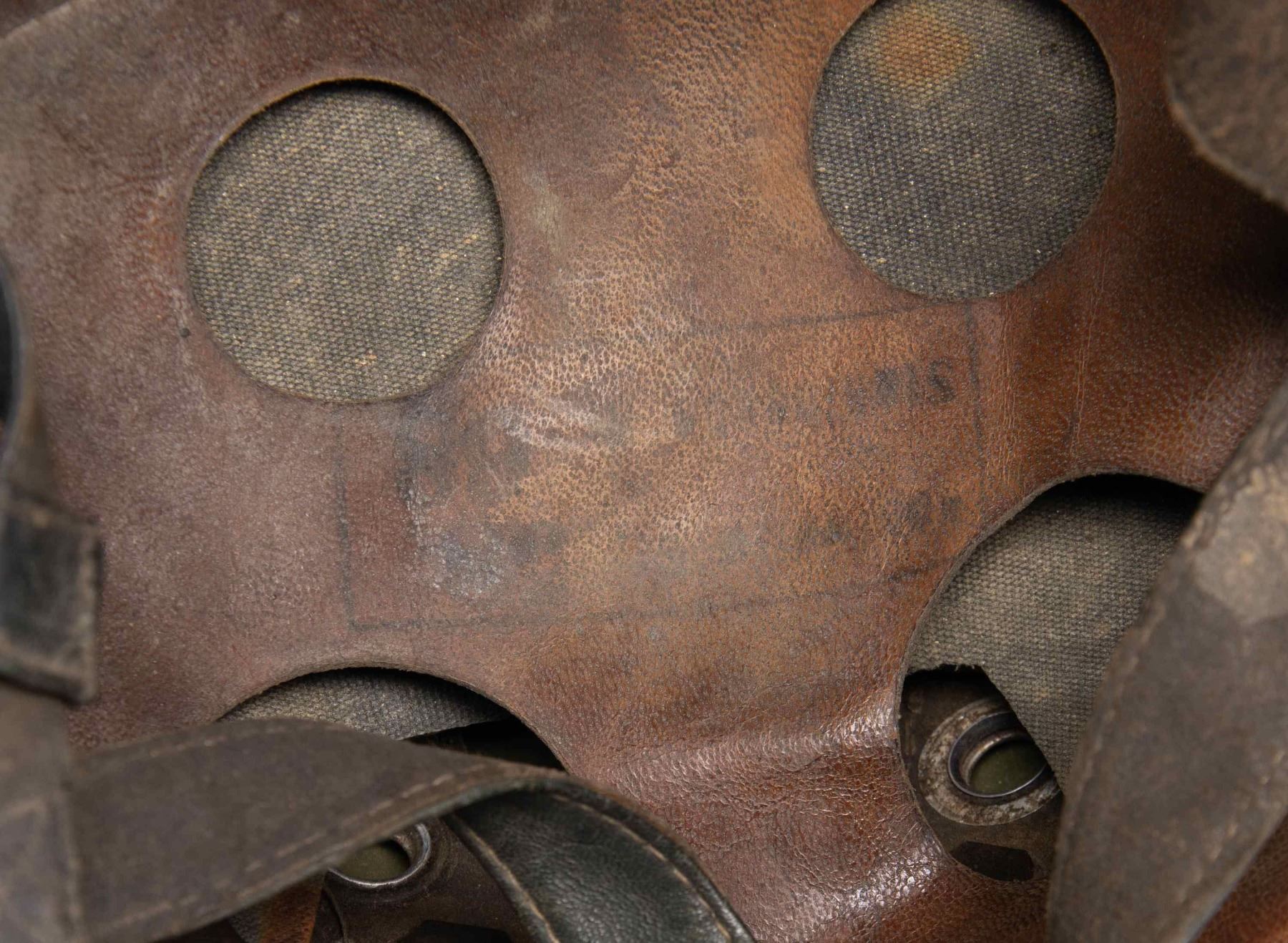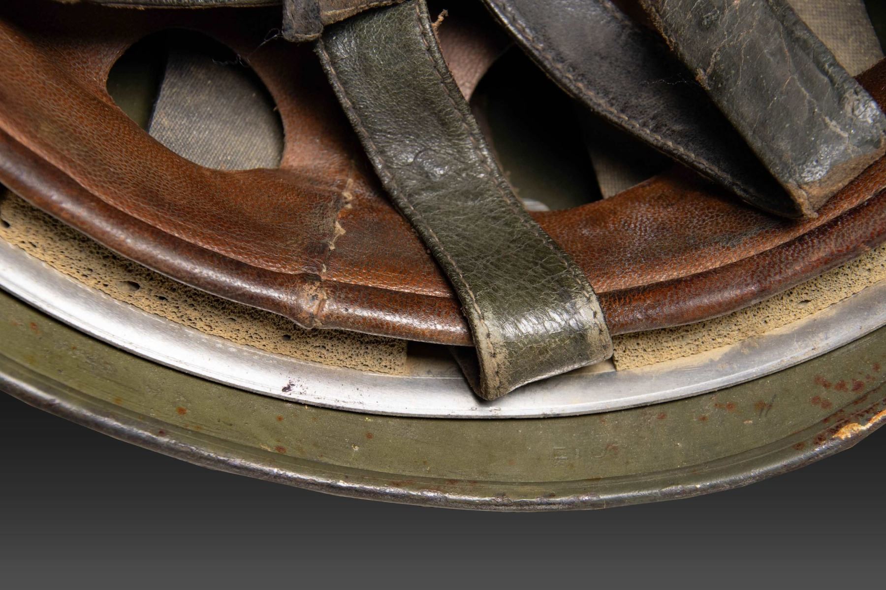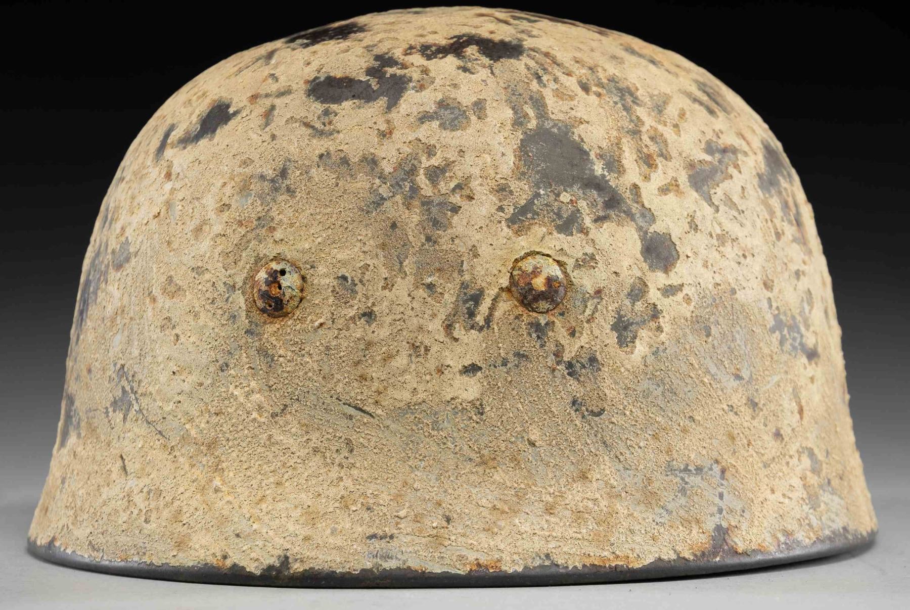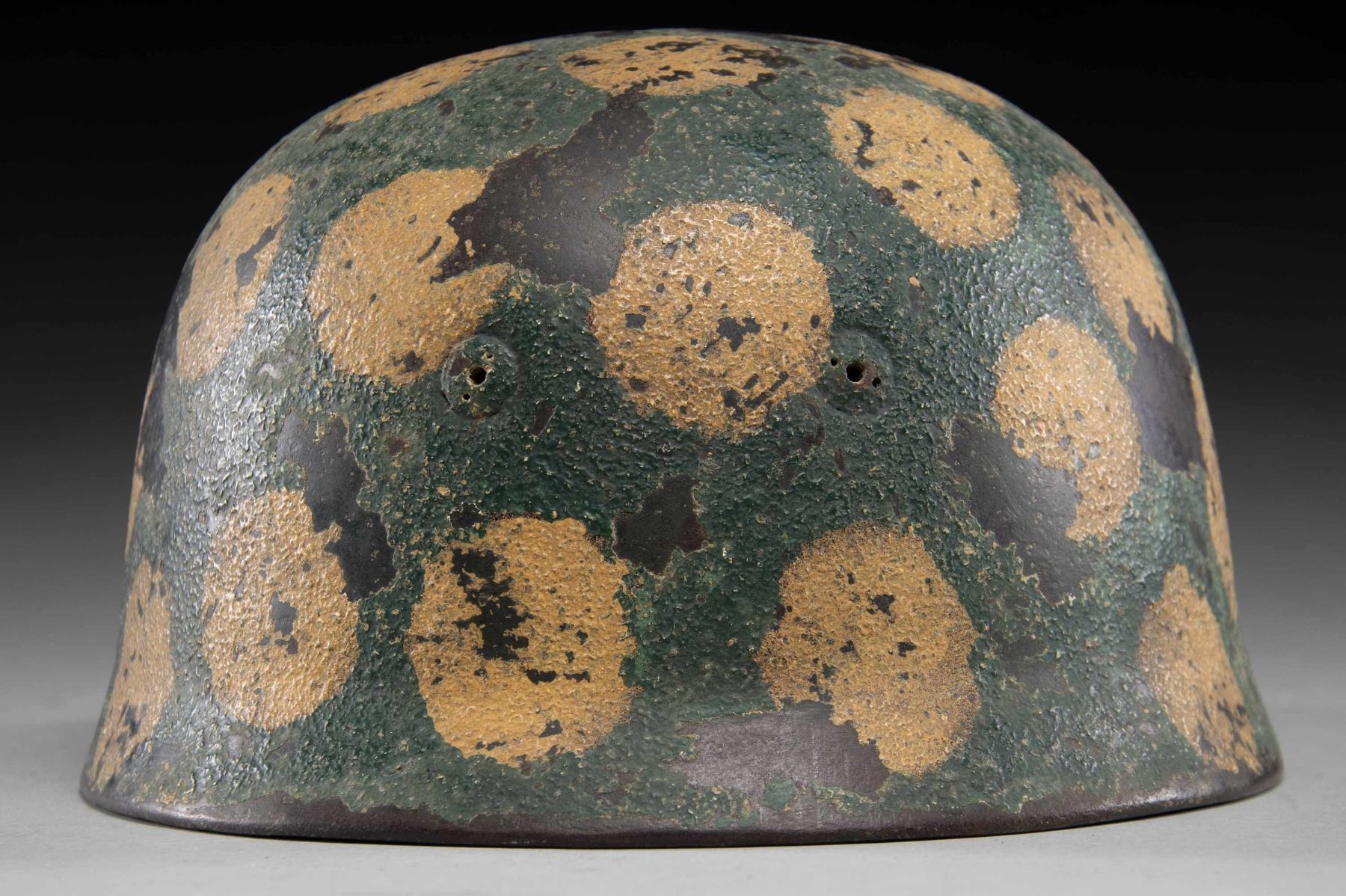 RESTORATION. 1) A fallschirmjager helmet with a painted finish that is extremely thick textured white camouflage. This double decal helmet has a Luftwaffe eagle on the left paired with the National colors decal on the right. The helmet is complete with harness and liner stamped "Kopfweite Gr 57 Stahlhaube Gr 68" & "Karl Heister BERLIN C.2 D.R.G.M.a.". Rear inside of helmet stamped "2141". Left inner side stamped "ET68". Shell, harness, and liner appear to be original and correct. However, the painted camo finish and decals appear to be post-war additions. Much attention has been paid to the details of this restored helmet. CONDITION: painted finish is 60% intact. Luftwaffe decal is 70%. National decal is 85%. Harness and liner show moderate wear. (02-23333/BF/BS). 2) This helmet's painted, camouflaged finish consists of a thick green base with numerous tan dots applied over the base. Helmet features a single Luftwaffe decal on the left side. Harness and liner are intact. Liner is marked "Kopfweite Gr 58 Stahlhaube Gr 68" & "Baumuster Heisler. Berlin C2 Hersteller. F. W. Muller jr". The entire helmet appears to be original and correct with the exception of the painted camo finish, which is of post-WWII origin. CONDITION: camouflage finish is approx. 70% intact. Harness and liner show moderate wear but are quite solid. Decal approx. 65%. (02-23334/BF/BS). $1,400-2,000 for lot.