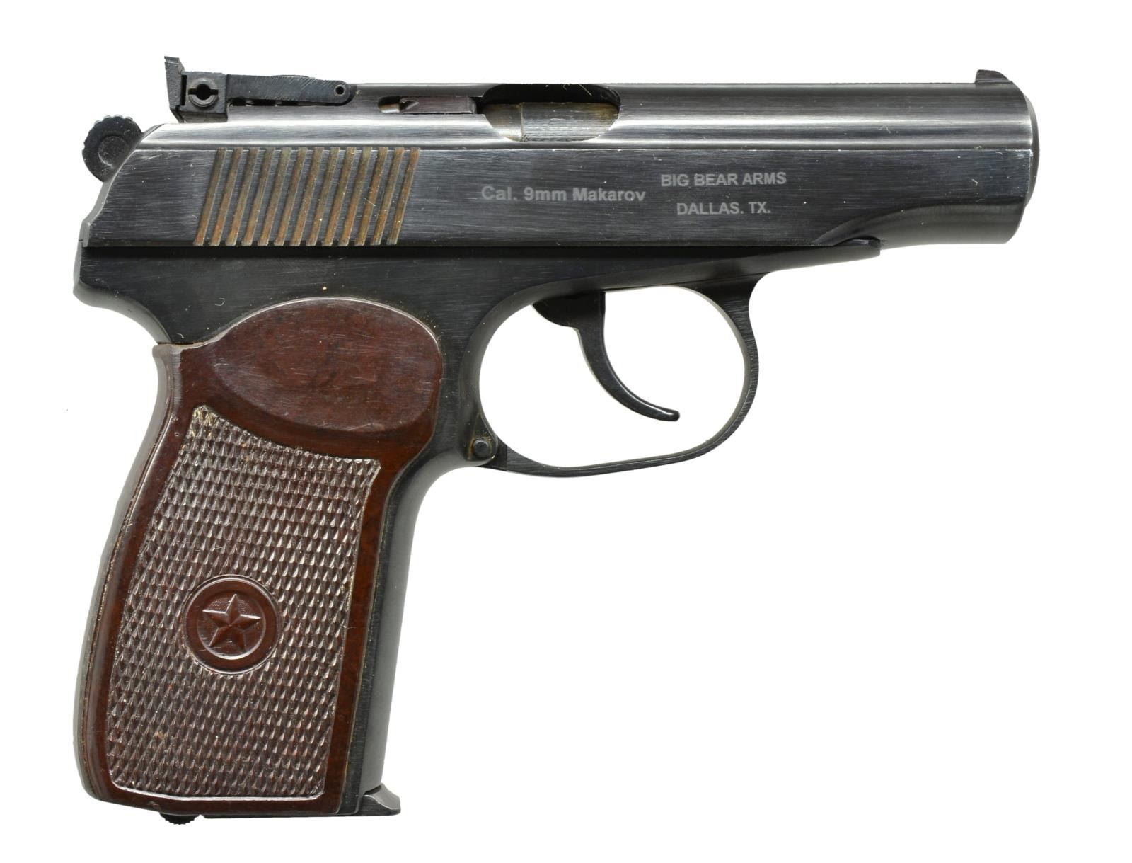 1) RUSSIAN. Cal. 9x18 MAK. S# AEC3850. Bbl. 3 3/4". Import marked on right side of slide. Frame has three acceptance marks on left rear. "PC," "encircled arrow" & tiny "SA01". Left side of slide marked "IJ70-18A" "Made in RUSSIA" "by IMEZ". Right side of slide marked "BIG BEAR ARMS" "DALLAS, TX" "Cal. 9mm Makarov". Fully adj. rear sight. Fixed front sight. SA/DA. Checkered brown composite grips w/ stars. MAGS: 2-8 rd. UNATTACHED ACCESSORIES: brown leather military holster, in good serviceable condition w/ light wear & flexing. CONDITION: grips have very light wear & handling marks. Metal retains 90% original blue finish w/ very light high point wear. Good, shiny bore. (21-821/RW). MODERN. 2) EAST GERMAN. Cal. 9mm MAK. S# BY 6830. Bbl. 3 3/4". Import marked on right side of frame. S#'s match on frame & slide. Frame marked on left side w/ circle in diamond indicating East German mfg. Boxed "K-100." "9mm MAK". "a" in circle of dots. Dated "62". Slide marked on left rear w/ circle in diamond. Frame marked on right side w/ import mark & "GERMANY." Fixed sights. Large mag. well for high capacity mags. Aftermarket black checkered rubber grip retained by Allen screw. MAGS: 2-8rd. w/ swell at bases to accommodate wider mag. well. UNATTACHED ACCESSORIES: tan leather military style shoulder holster w/ white web straps. Holster marked "Mdl III/I" "Made in Germany." Holster has light wear, but appears in good serviceable condition. CONDITION: grip is in very good condition. Retains high degree of arsenal rework blue w/ light high point wear. Very good shiny bore. (21-826/RW). CURIO. $400-800.
