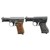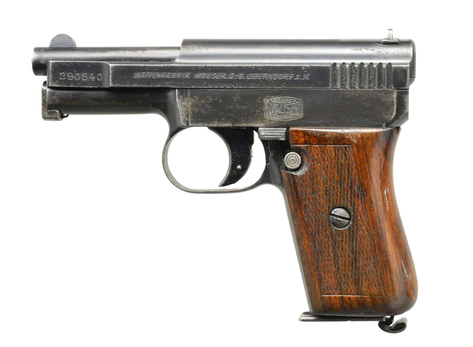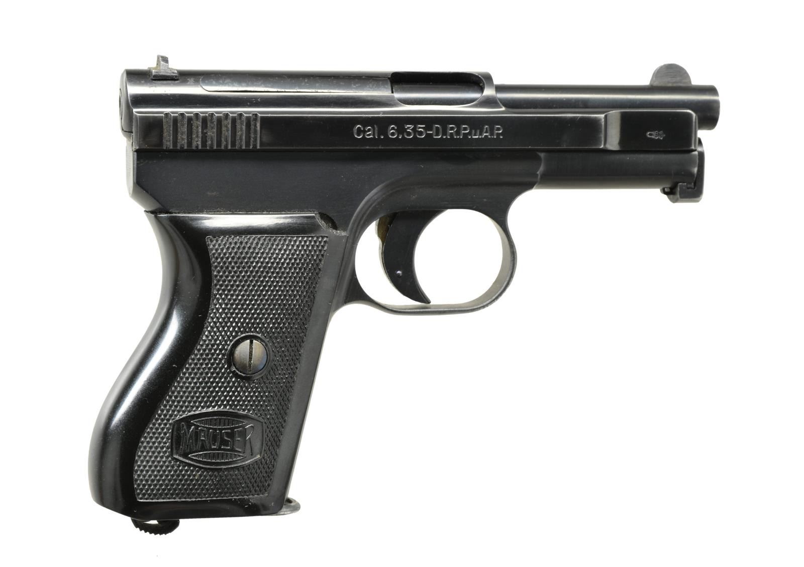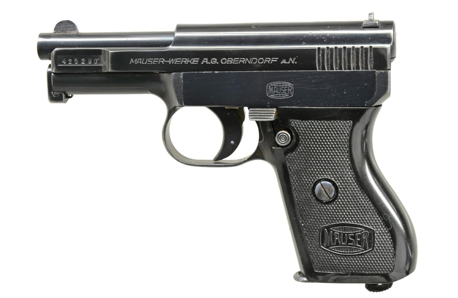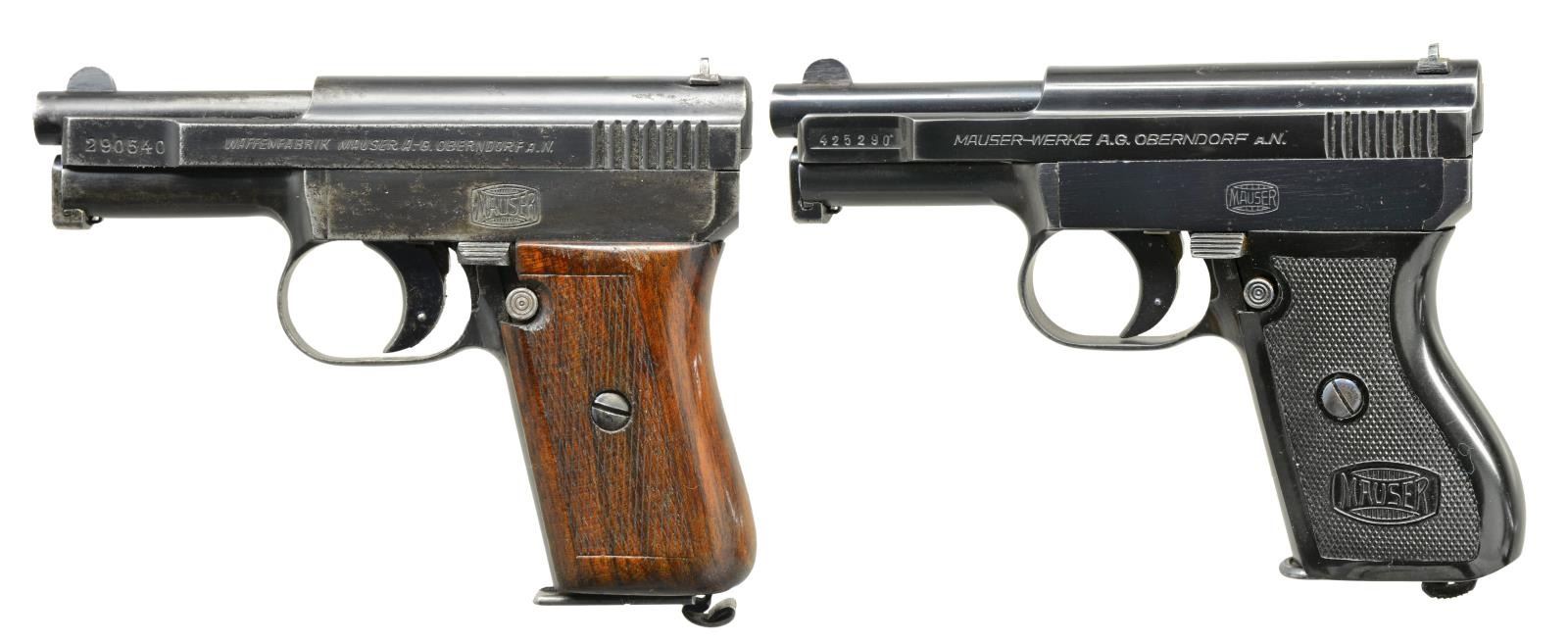 BOTH: Cal. 25 ACP. Bbls. 3 1/8" (80mm) w/ integral semi-circular sight blades; drift adj. dovetailed rear sights on slides. Mauser banners on sideplates & cal. markings on right side of slides. MAGS: 2 factory 9 rd.; blued w/ indicator holes & unfinished w/ indicator slots. Mfg. 1910-1934 w/ blued finishes. Thumb & mag. safeties. Mag. latches at butts. Crown U proofed slides & bbls.