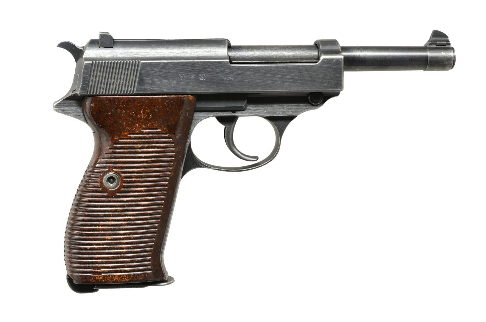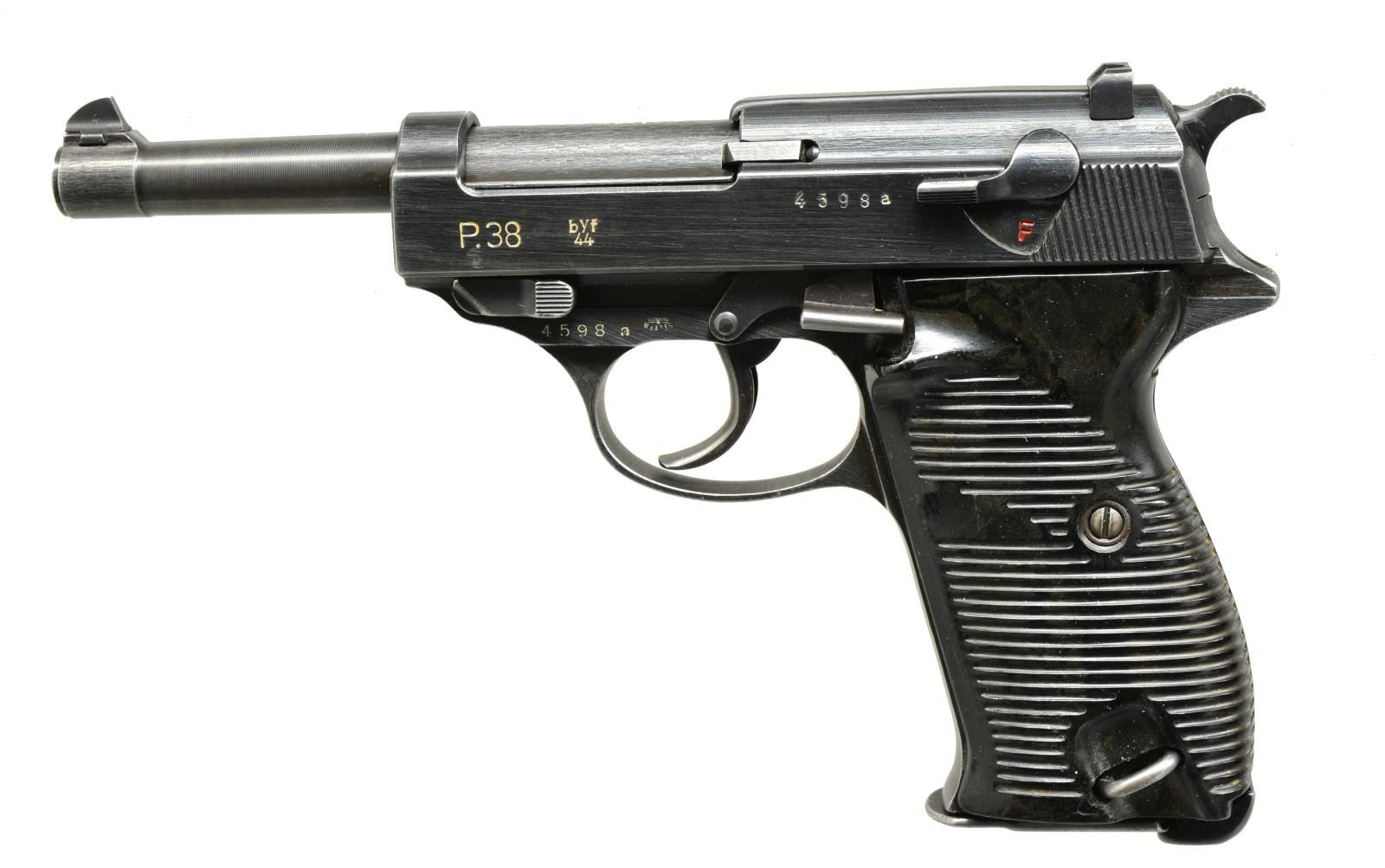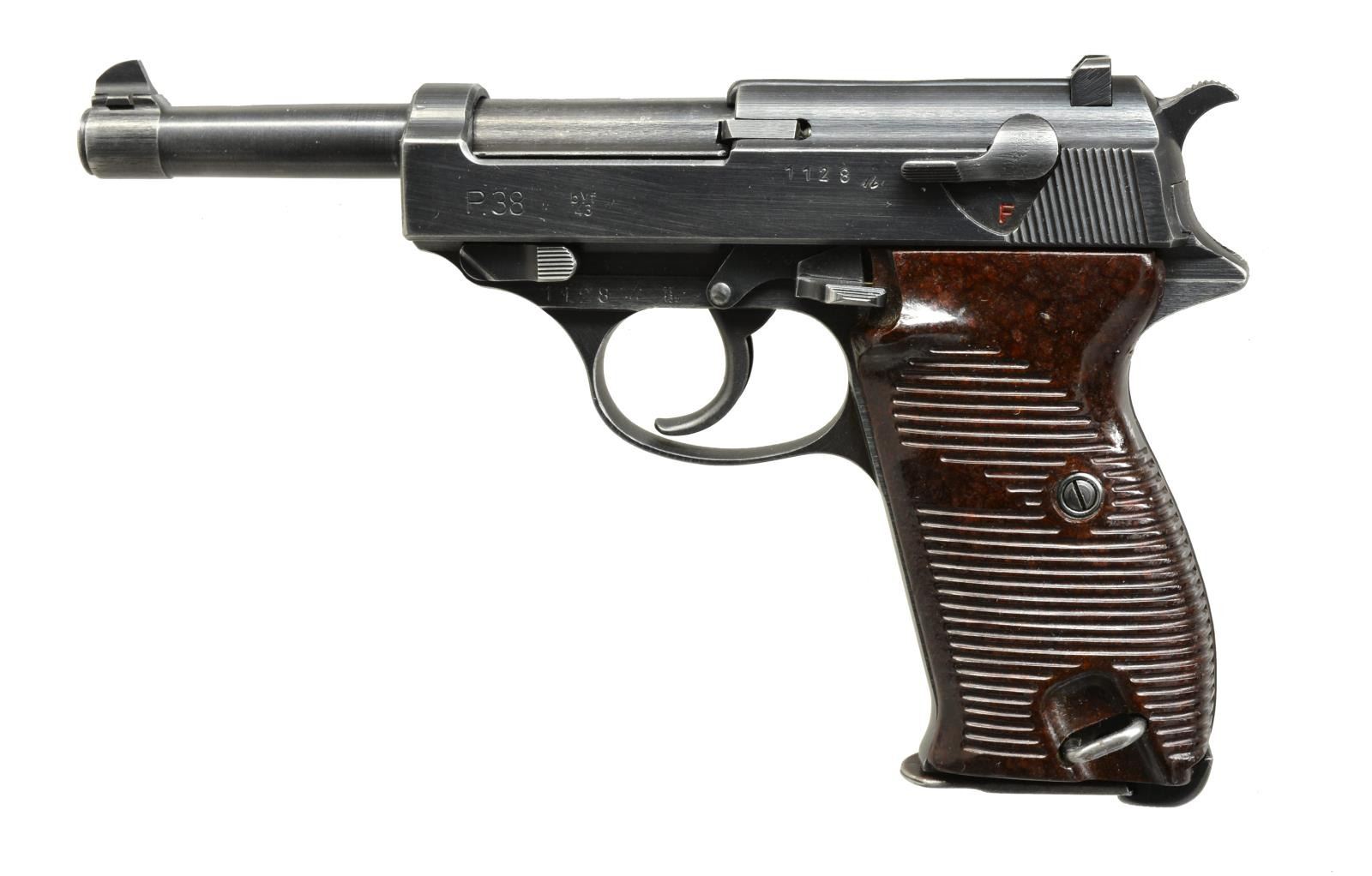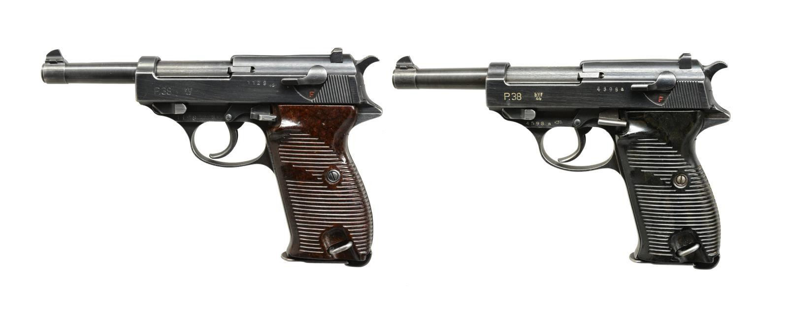 BOTH: cal. 9mm Luger. Bbls. 5". 1) S# 1128h. Mfg. 1943 w/ "byf / 43" on slide. Frame, slide, bbl. & locking block have matching numbers plus matching eagle 135 proofs. Brown Bakelite grips w/ horizontal grooves & appearance of wood chip composition. MAGS: 1 good 8 rd. marked "P.38v" plus eagle "359" proof on spine. CONDITION: very good overall appearance w/ typical high point wear plus thinning on right side of slide & front strap. Near excellent grips. Very good bore w/ occasional sm. spot appearing to be bullet material buildup. (21-1351/NW). 2) S# 4598a. Mfg. 1944 w/ "byf / 44" on slide. Frame, slide, & bbl. have matching numbers plus matching "WaA135" proofs; unmarked locking block w/ eagle "359" proof. Black Bakelite grips w/ horizontal grooves. MAGS: 1 good 8 rd. marked "P.38v" plus eagle "WaA135" proof on spine. CONDITION: very good overall appearance w/ typical high point wear plus thinning on front strap. Right side of bbl. has 2 adjacent vertical impact marks. Near excellent grips. Good to very good bore w/ appearance of bullet material buildup in corners of grooves. (21-1352/NW). BOTH CURIO. $1,000-1,600.