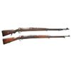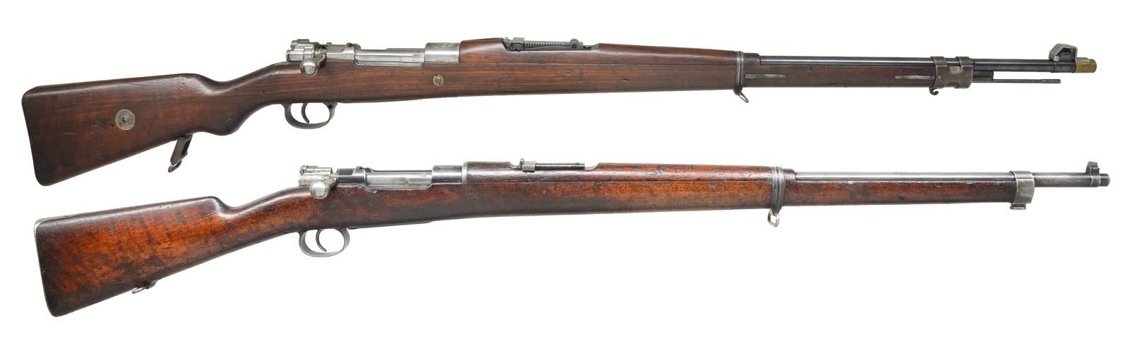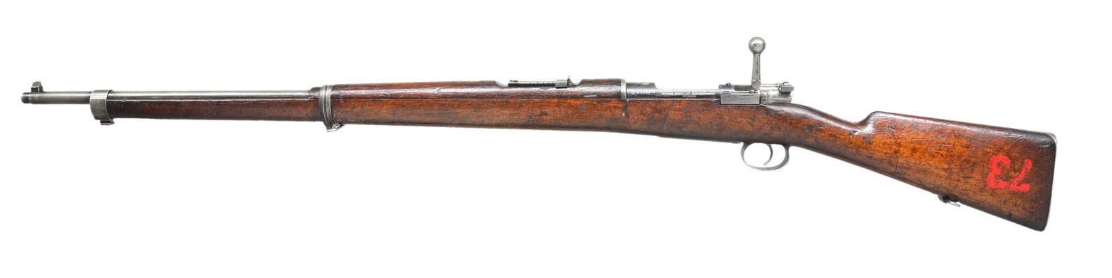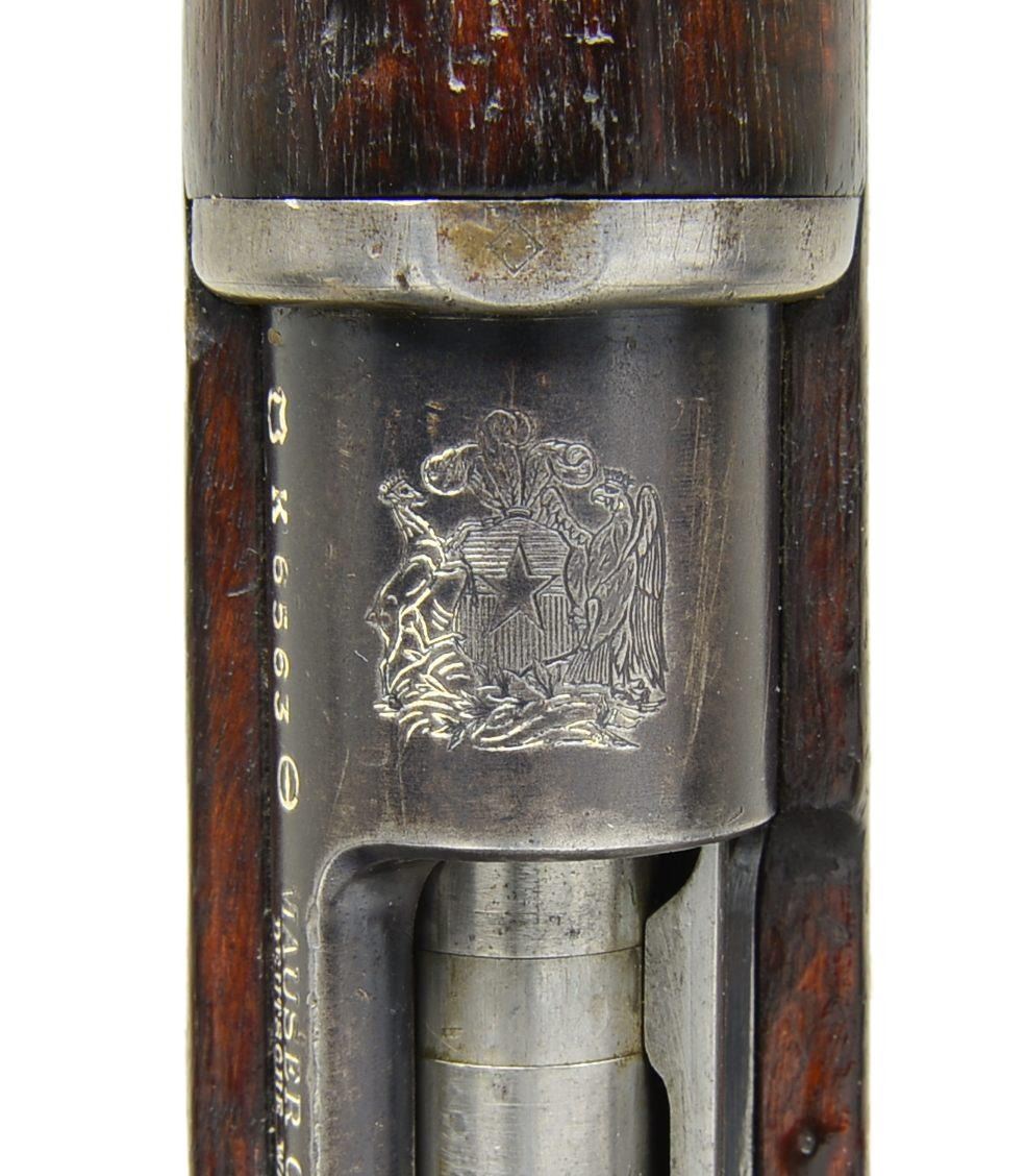 2) DWM CHILEAN MODEL 1895 MAUSER. Cal. 7 mm Mauser. S# K6563. S# match on receiver, bolt, rear sight & trigger guard. Straight bolt handle. Receiver is marked on left side "MAUSER CHILENO MODELO 1895 DEUTSCHE WAFFEN-UND MUNITIONSFABRIKEN. BERLIN". Receiver ring has Chilean crest. Ladder rear sight graduated to 2,000 meters. Inverted V front sight. Cleaning rod is not present. Walnut stock set Buttstock is marked on left side with "73" in red paint. CONDITION: stock set has seen heavy service w/ wear, dents, staining & scratches throughout and has thinning coat of added finish. Metal turning overall gray w/ worn treated blue w/ scattered sm. dents & scratches. Fair worn dark bore w/ oxidized appearance. (21-3276/RW). BOTH CURIO. $800-1,200.