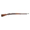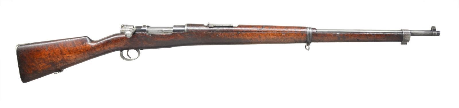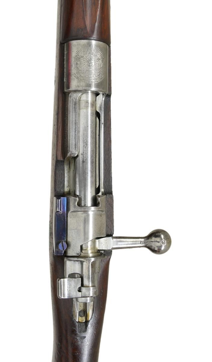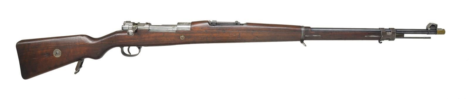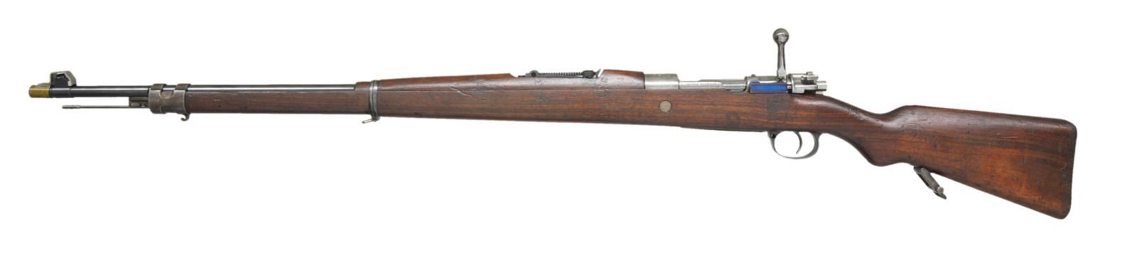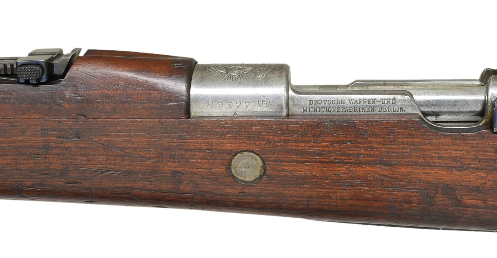 1) DWM BRAZILIAN 1908. Cal. 7X57 Mauser. S# B9977. Bbl. 29". All visible numbers match except bolt sleeve, safety & cocking piece. Import marked underneath bbl. Straight bolt handle. Receiver rail marked on left side "DEUTSCHE WAFFEN-UND MUNITIONSFABRIKEN, BERLIN". Receiver ring has sharp legible Brazilian crest & "MOD. 1908". Tangent rear sight graduated to 2000 meters. Inverted V front sight. Has bayonet bar, cleaning rod & parade hook. Bottom swivel including detachable butt swivel. Walnut stock set. Stock has marking disc marked w/ "3" & encircled 6 pointed star. CONDITION: stock set has original finish w/ moderate wear, dents & scratches throughout. Metal retains 60% thinning original blue finish. Bolt stop has notable fire blue. Bolt & receiver have bright metal turning gray. Very good shiny bore. (21-2785/RW).