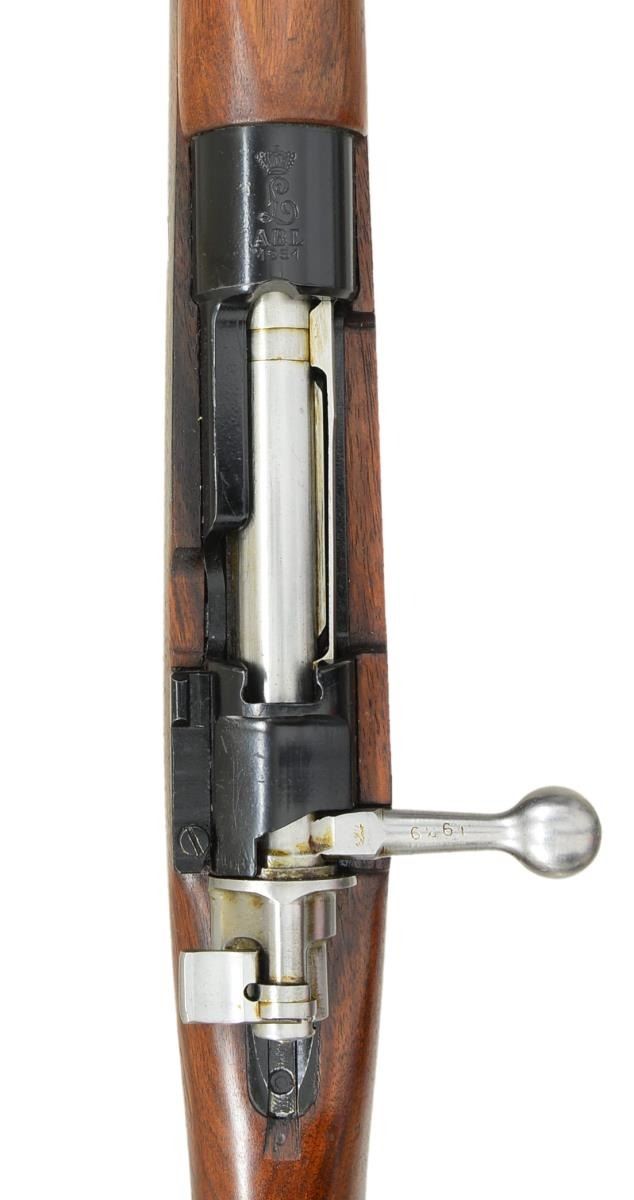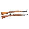 2) FABRIQUE NATIONALE BELGIAN MODEL 50 MAUSER. Cal. 30-06. S# 6261. Bbl. 23 1/4". Numbers match on receiver & bolt. Straight bolt handle. Receiver marked "FABRIQUE NATIONALE". Receiver ring has Belgian crest dated 1951. Tangent rear sight graduated to 1900 meters. Inverted V front sight. Has bayonet bar, cleaning rod not present. Bottom swivels. Stamped ribbed buttplate. Walnut stock set. CONDITION: stock has light original finish w/ light wear & scattered handling marks. Metal has very lg. percentage of original black painted finish w/ light wear & scratches. Very good shiny bore. (21-2803/RW). BOTH CURIO. $700-1,000.
