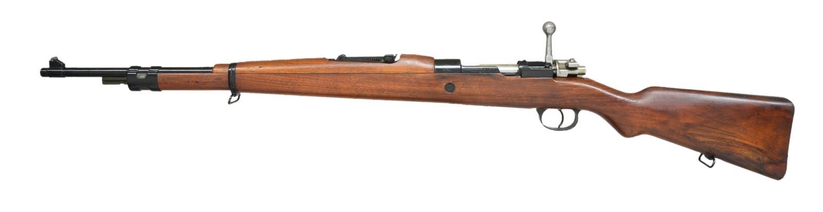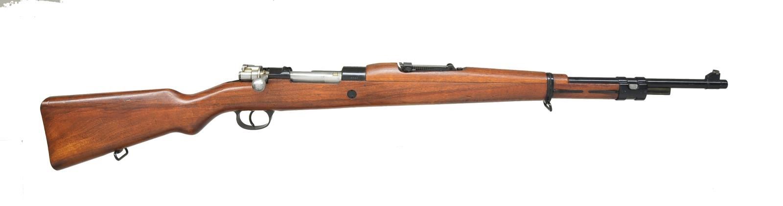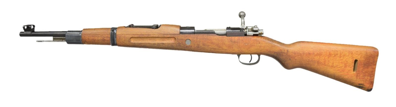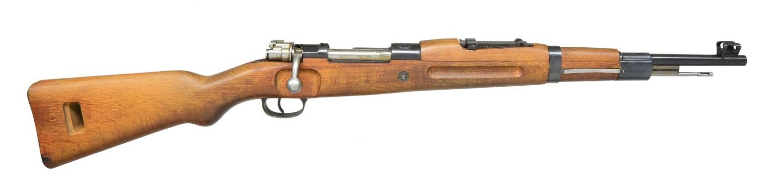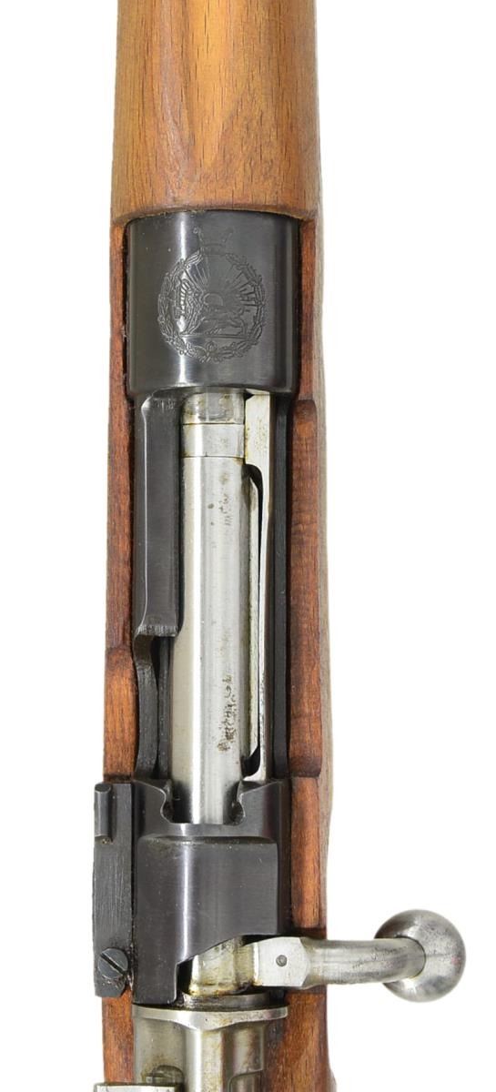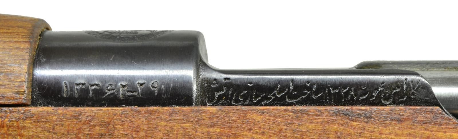 1) IRANIAN MODEL 49 CARBINE. Cal. 8mm. S# 13362-29. Bbl. 17 15/16". All visible numbers in Farsi appear to match. Receiver ring has Iranian lion crest. Turned down bolt handle. Tangent rear sight graduated to 2000 meters w/ Arabic numerals. Inverted V front sight w/ integral protective ears. Cleaning rod & bayonet bar are present. Provision for side sling. Hardwood stock w/ grasping grooves. CONDITION: stock set has moderate staining w/ scattered handling marks. Sm. crack on top right side at pistol grip. Metal retains 90% original blue. Near excellent shiny bore. (21-2795/RW).