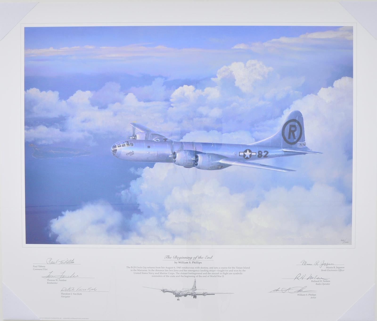 2) SIGNED, LIMITED EDITION PRINT, THE BEGINNING OF THE END BY WILLIAM S. PHILLIPS: #692 of 1000. A beautiful depiction of the B-29, the "Enola Gay" as it returns from its famous flight on August 6, 1945, heading to Tinian Island in the Marianas. In the distance, Iwo Jima, and the emergency landing strips are visible, after being fought for by the United States Marine Corps & Navy in another epic battle illustrating both the beginning & the end of WWII. The print is signed by Enola Gay Command Pilot Paul Tibbets, Bombardier, Thomas W. Ferebee, Navigator Theodore J. Van Kirk, Bomb Electronics Officer, Morris R. Jeppson, Radio Operator Richard H. Nelson & artist, William S. Phillips. Print measures 23"x27" and mounted on 29"x33" foam boars, sealed in plastic. CONDITION: Aside from a small 2.5" light impression that is visible under close inspection, there are no apparent wrinkles or blemishes visible. All signatures are dark & legible and foam mounting is undamaged, demonstrating proper storage and handling. (02-16953-20/JZ). $200-400.