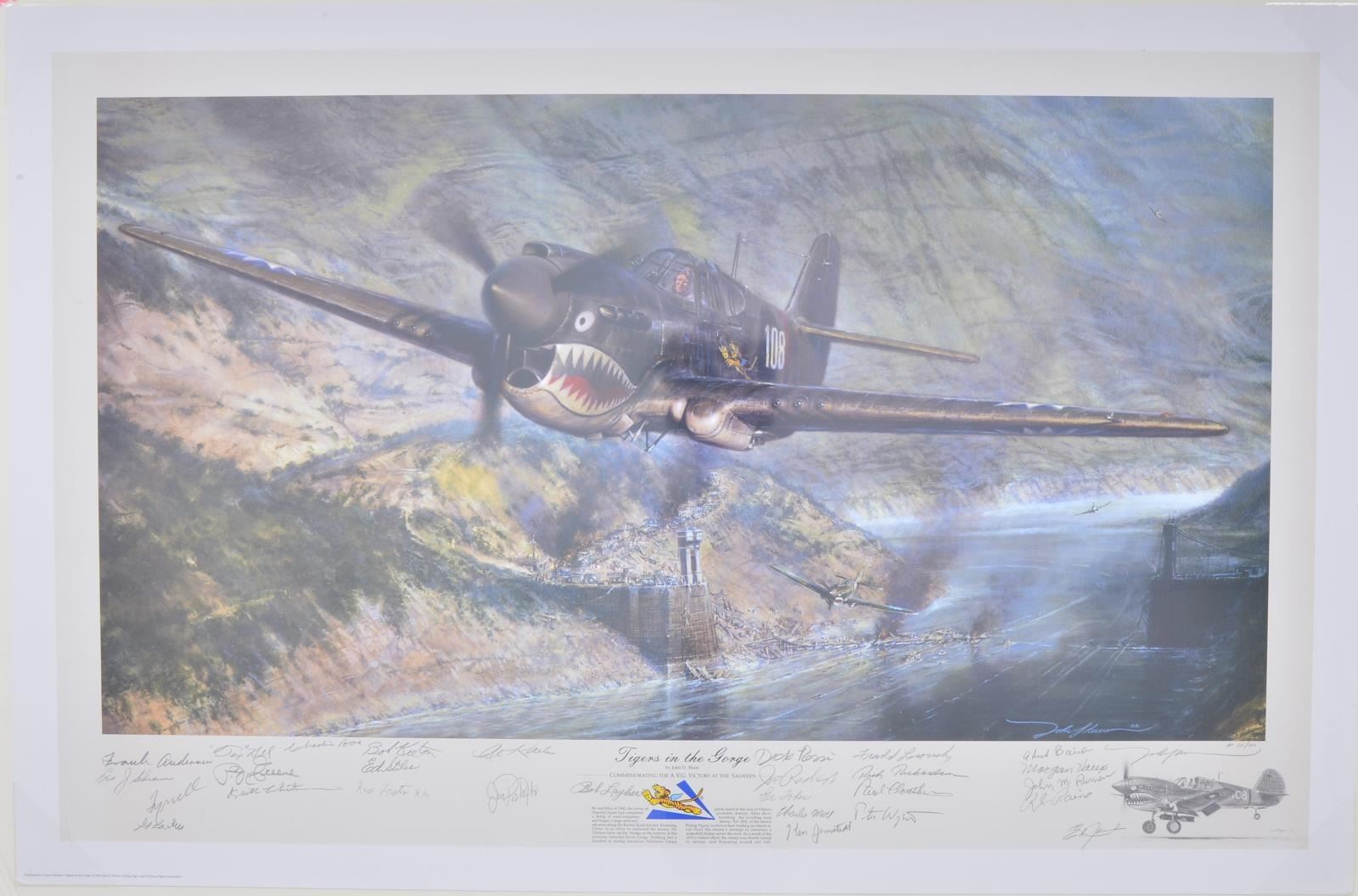 1) TIGERS IN THE GORGE 1 OF 100 SIGNED PRINTS BY JOHN D. SHAW: Limited edition, artist signed print, "Tigers in the Gorge". This print is #10 of only 100. Print is commemorating the AVG (American Volunteer Group), later known as "The Flying Tigers" Victory at the Salween. Thanks to the skill & bravery of these amazing American pilots, what would become the demise of China was avoided that day by stopping the reconstruction of a bridge that would have reconnected road travel for Japan. It is signed by 28 different member of "The Flying Tigers". The print measures 24"x37" and mounted on a foam board measuring 28"x40", protected by plastic. CONDITION" Print has no visible damage of any kind and all signatures are dark and clear, protected by plastic wrap. Foam board is undamaged, showing proper storage since mounting.