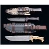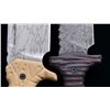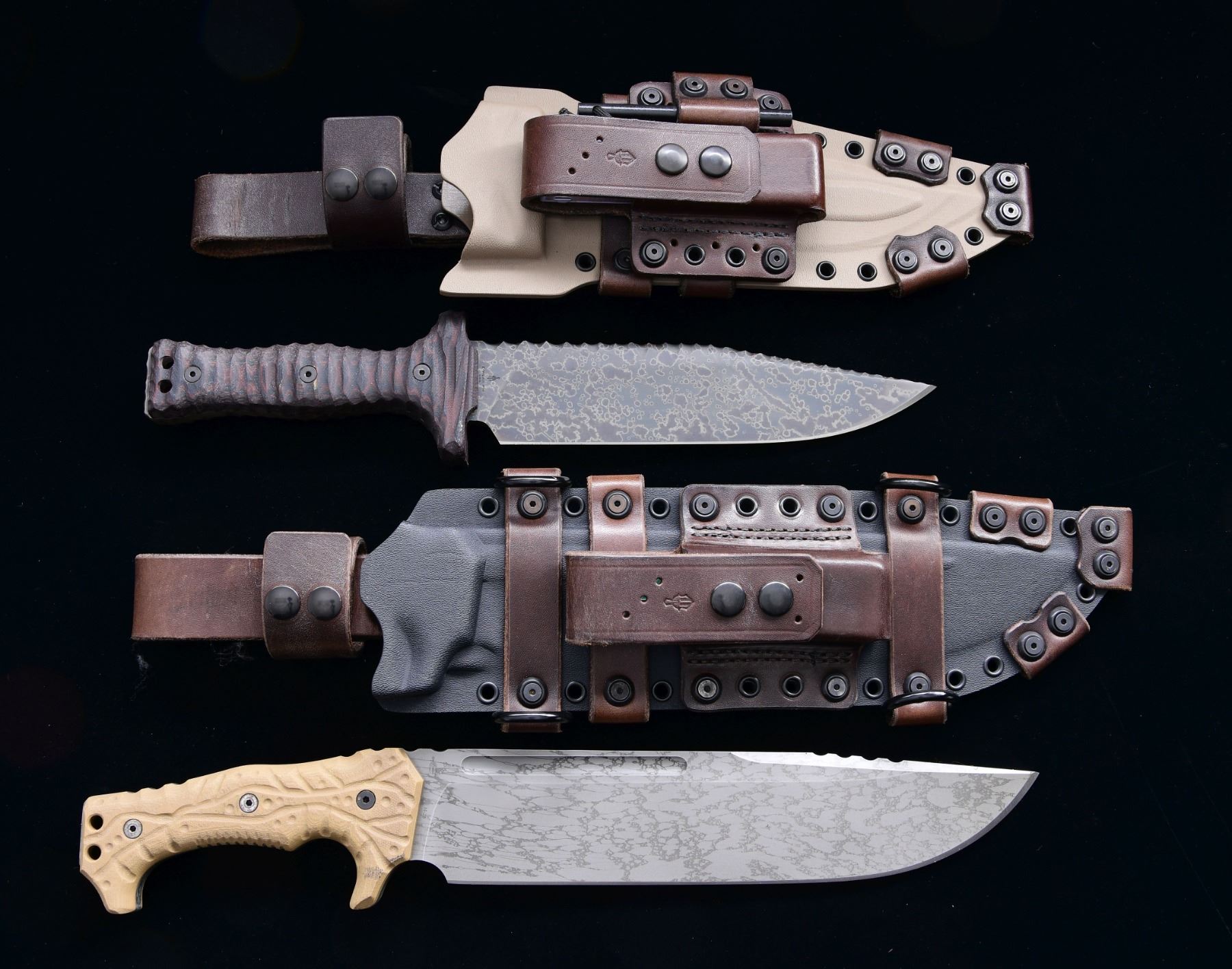 1) A Miller Bros. Bowie-style knife measuring 16 1/2" overall with a 14 3/4" knife that has an 8 5/8" blade. A like-new M-22 knife with a darkened patterned blade showing a rippled spine. The knife has a composite fiberglass and epoxy hilt known as a G-10 or Garolite composite. Kylex scabbard with leather trim, belt loop, edge protectors, and front stone holder. CONDITION: like new. 2) A Miller Bros. massive side knife measuring 18" overall with a 16 3/4" knife that has an 11" blade. A like-new M-28 knife with gray patterned blade showing an embellished spine. The knife has a composite fiberglass and epoxy hilt known as a G-10 or Garolite composite. Kylex scabbard with leather trim, belt loop, edge protectors, and front stone holder. UNATTACHED ACCESSORIES: each knife has a protective zippered soft case with a certificate of authenticity from Miller Bros. CONDITION: like new. (02-23960/BF). $1,500-3,000.