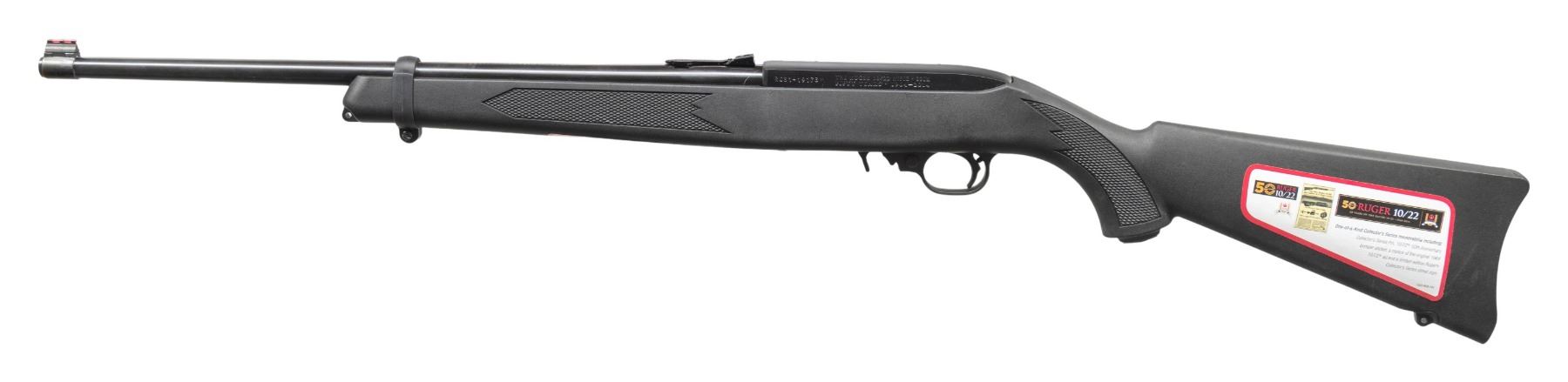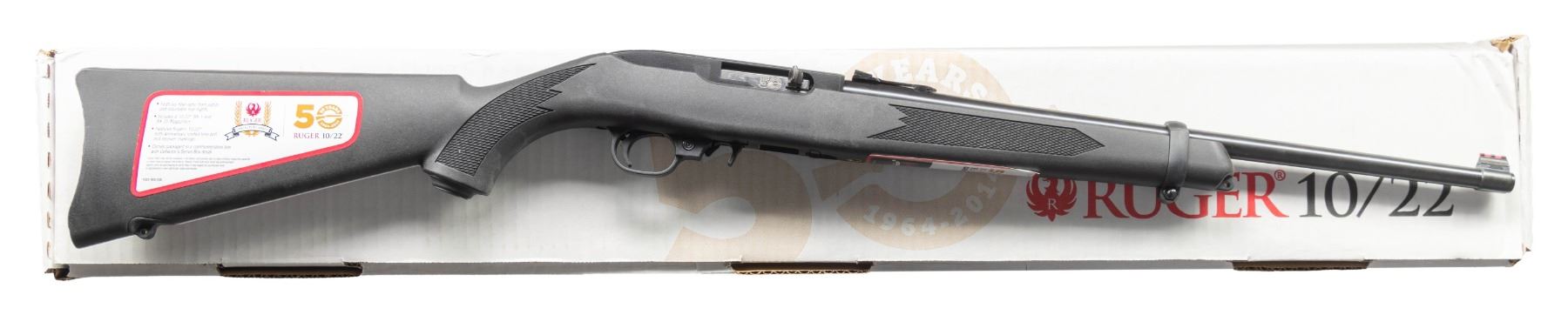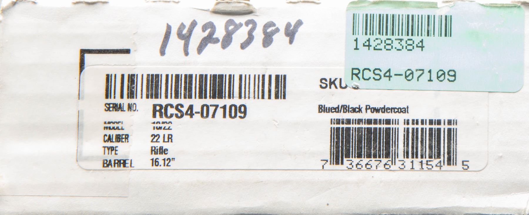 1) FIRST SERIES. S# RCS1-19173. Approx. 31,000 Mfg. 2014-2015 as Catalog # 10/22-RCS-2; Model 21104. Bbl. 18.5". Hi-Viz sights. Receiver D&T for scope rail. Black synthetic stock w/ retailer stickers. Synthetic trigger assembly w/ extended mag. release. MAGS: 1 BX-10 rd. mag. & 1 BX-25 mag. UNATTACHED ACCESSORIES: matching box containing Ruger paperwork, lock, rail, pin & street sign. CONDITION: as NIB. (24-3068/MD).