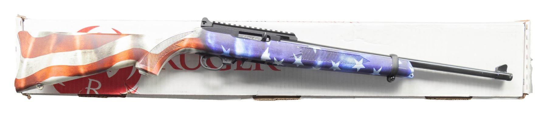 2) FOURTH EDITION, "VOTE 2020". S# RCS4-07109. Mfg. 2020 as Cat # Model 31154. Bbl. 18.5". Thread protector. Protected blade front sight. Ghost ring adj. rear sight. American Flag synthetic stock. One piece scope rail. Bolt marked "Collector's Series". Synthetic trigger assembly w/ extended mag. release. MAGS: 1 BX-10 rd. UNATTACHED ACCESSORIES: matching box containing Ruger paperwork, lock, pin & "RUGER VOTE 2020" sign. CONDITION: as NIB. (24-3183/MD). ALL MODERN. $400-600.